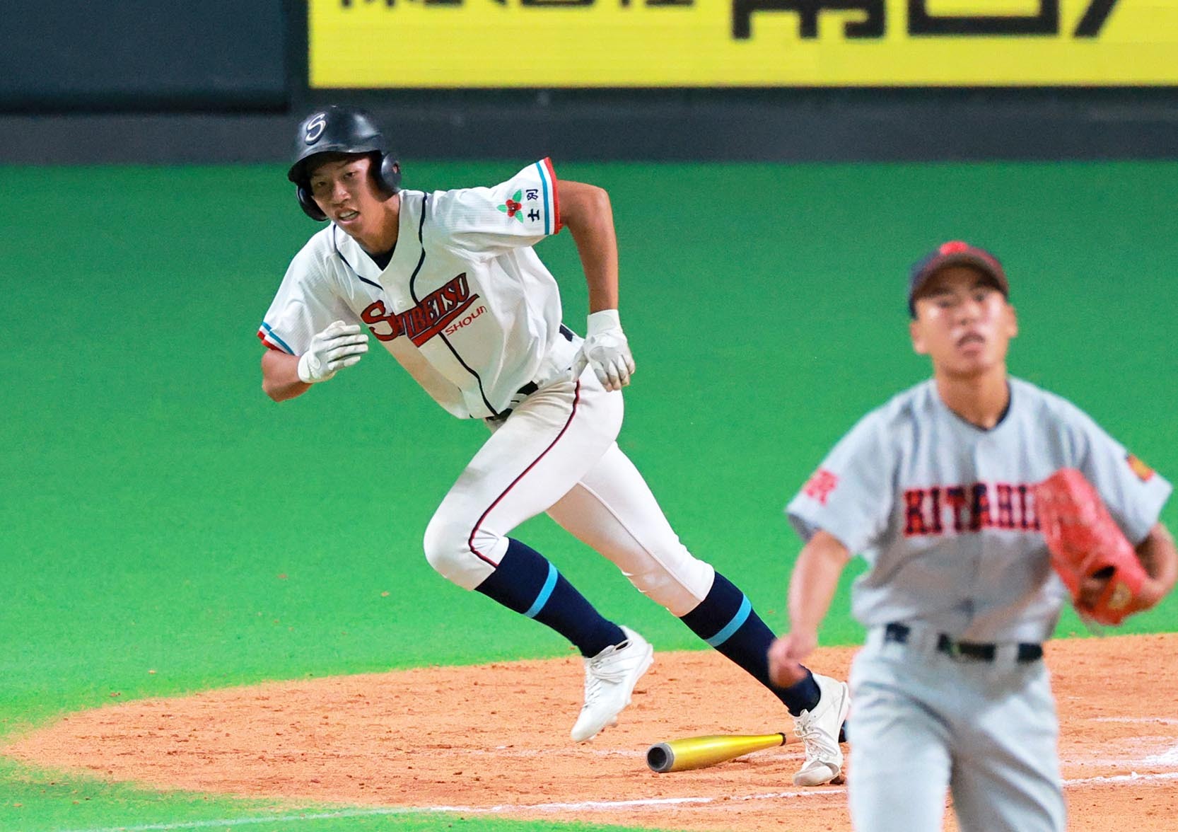 俊足の仕事人が、決勝のホームを踏んだ。4-4の七回無死。士別翔雲の4番・吉松武外野手(2年)が安打で出塁すると、すかさず一塁コーチャーを務めていた小林柊也外野手(2年)が代走で送られた。