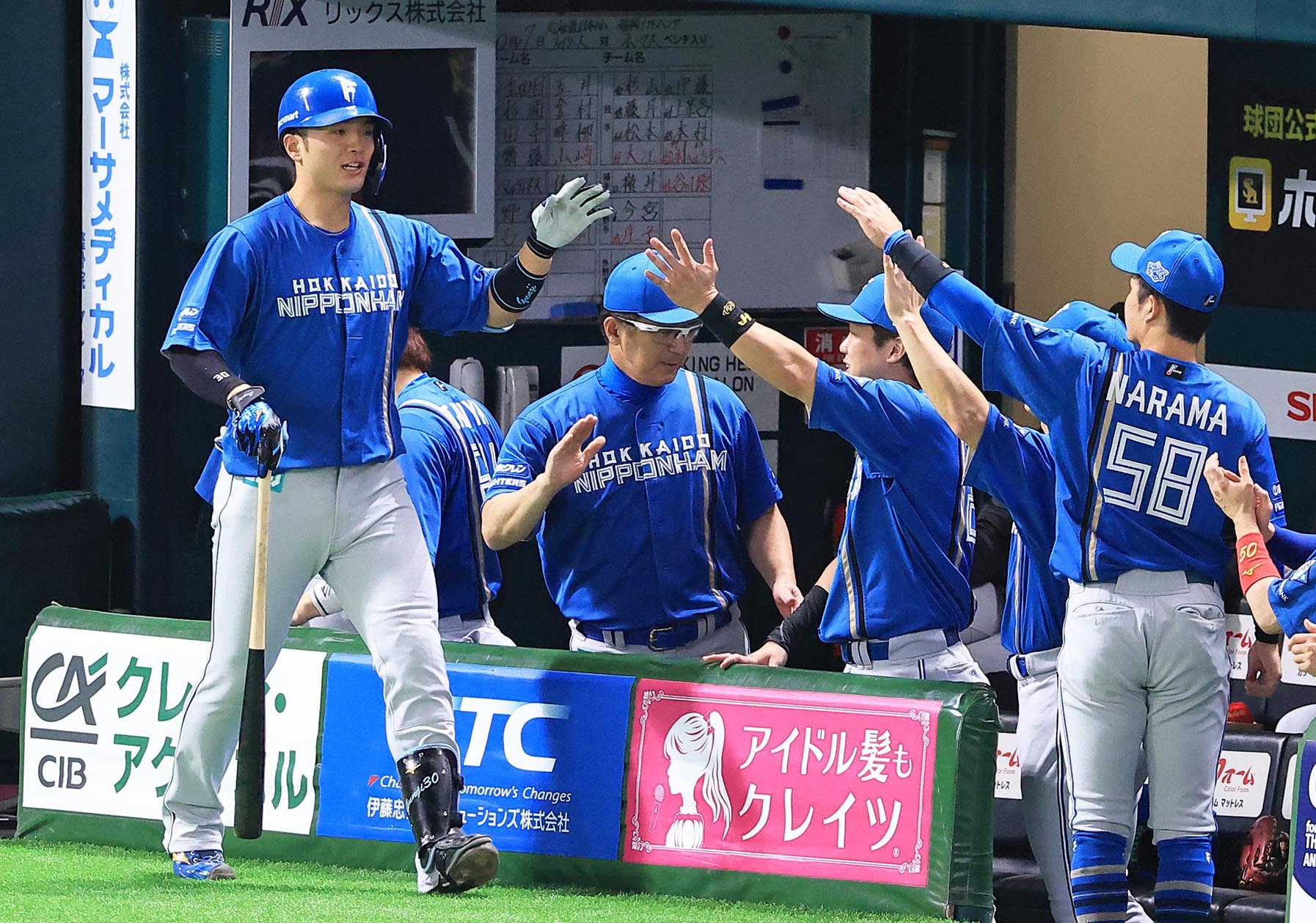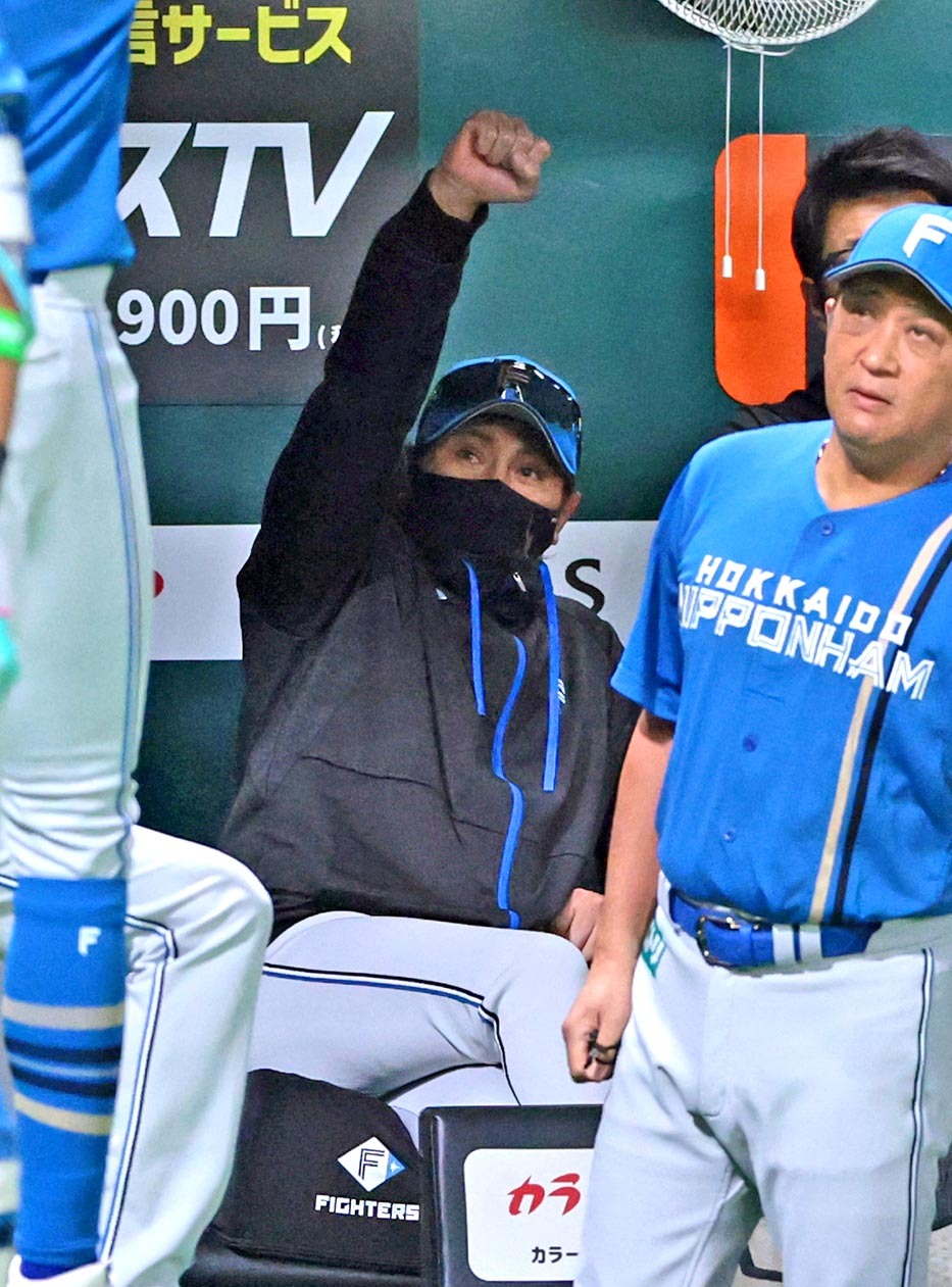 一回1死一、三塁、郡司の犠飛で先制し、拳を突き上げる新庄監督(中央)=撮影・宮永春希