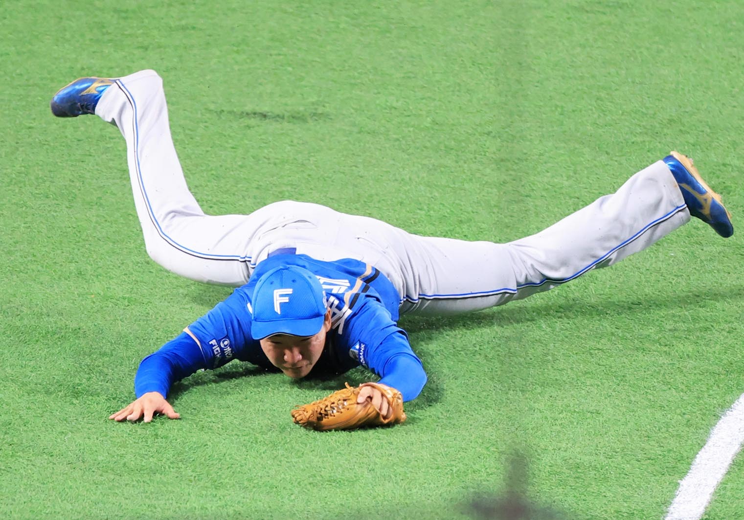 七回2死一塁、ソフトバンク・正木の打球を好捕する山県=撮影・岩崎勝