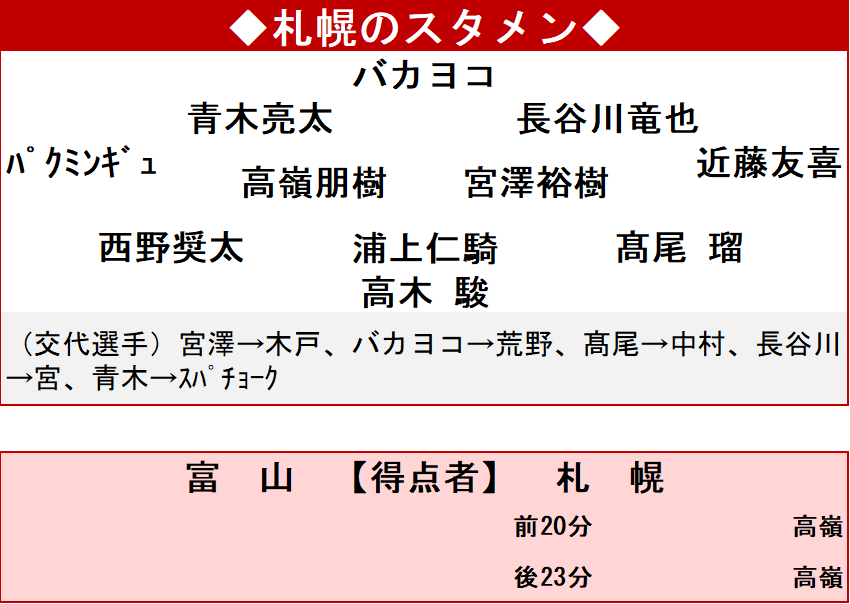 北海道コンサドーレ札幌はカターレ富山とアウェーで対戦し、2-0で勝利した。MF高嶺朋樹主将(27)がミドルシュート2本を決めて勝利を呼び込み、札幌は連敗を「2」で止めて完封は5試合ぶりとなった。