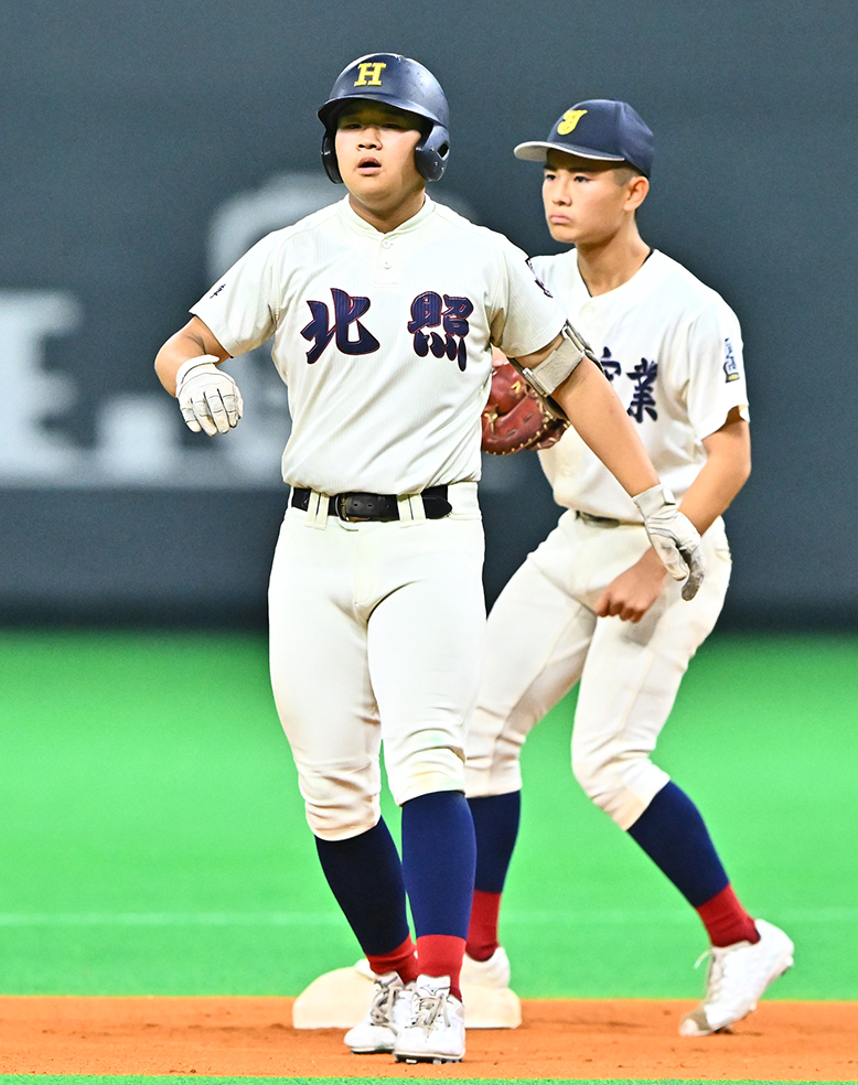 這い上がった4番が、全道の頂に迫っている。旭川実業との準決勝、一回2死一塁。北照の長谷川世和(せな)内野手(2年)が1ストライクからのカーブを左翼線に運んだ。一走の手代森輝斗主将(2年)が長駆生還を果たし、いきなり先制点をもたらした。