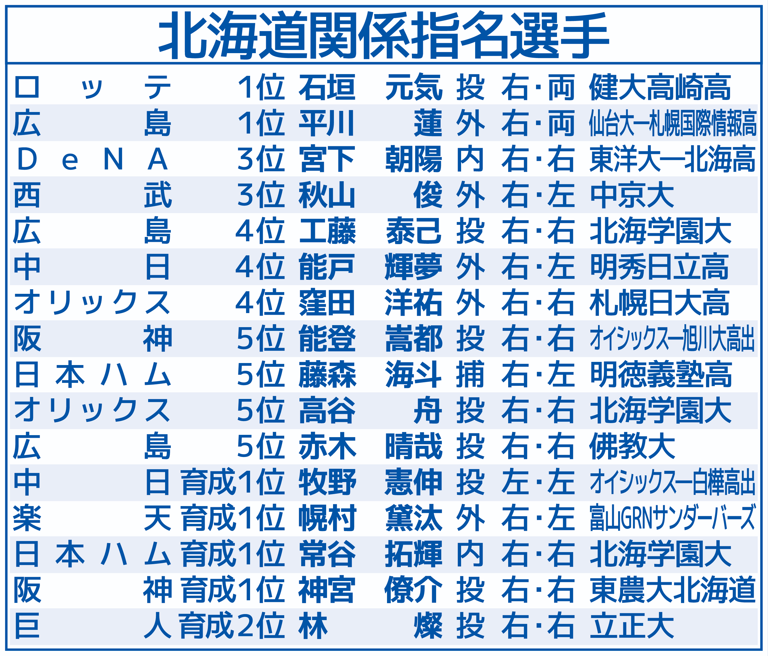 中日の育成1位で指名された牧野憲伸投手(26、オイシックス新潟アルビレックスBC、白樺高出)は富士大を経て独立リーグ入り。日本ハムの杉浦稔大投手(33)のはとこだ。楽天・育成1位の幌村黛汰投手(21、富山GRNサンダーバーズ)は新ひだか町出身。帝京長岡高(新潟)を経て富山のクラブチームでNPB入りを目指していた。阪神・育成1位の神宮僚介投手(東農大北海道4年)は群馬・桐生第一高出身。大学3年のときに右肘を痛めトミージョン手術を受け、4年秋に復帰し道6大学野球優勝に貢献。明治神宮大会北海道代表決定戦で、自己最速を更新する148キロをマークした。巨人・育成2位の林燦(きら)投手(立正大4年、広陵高)は千歳市出身で、最速151キロ右腕。