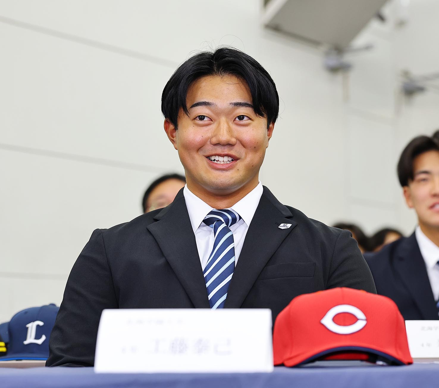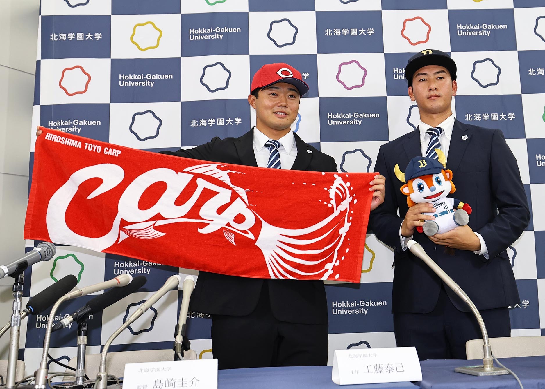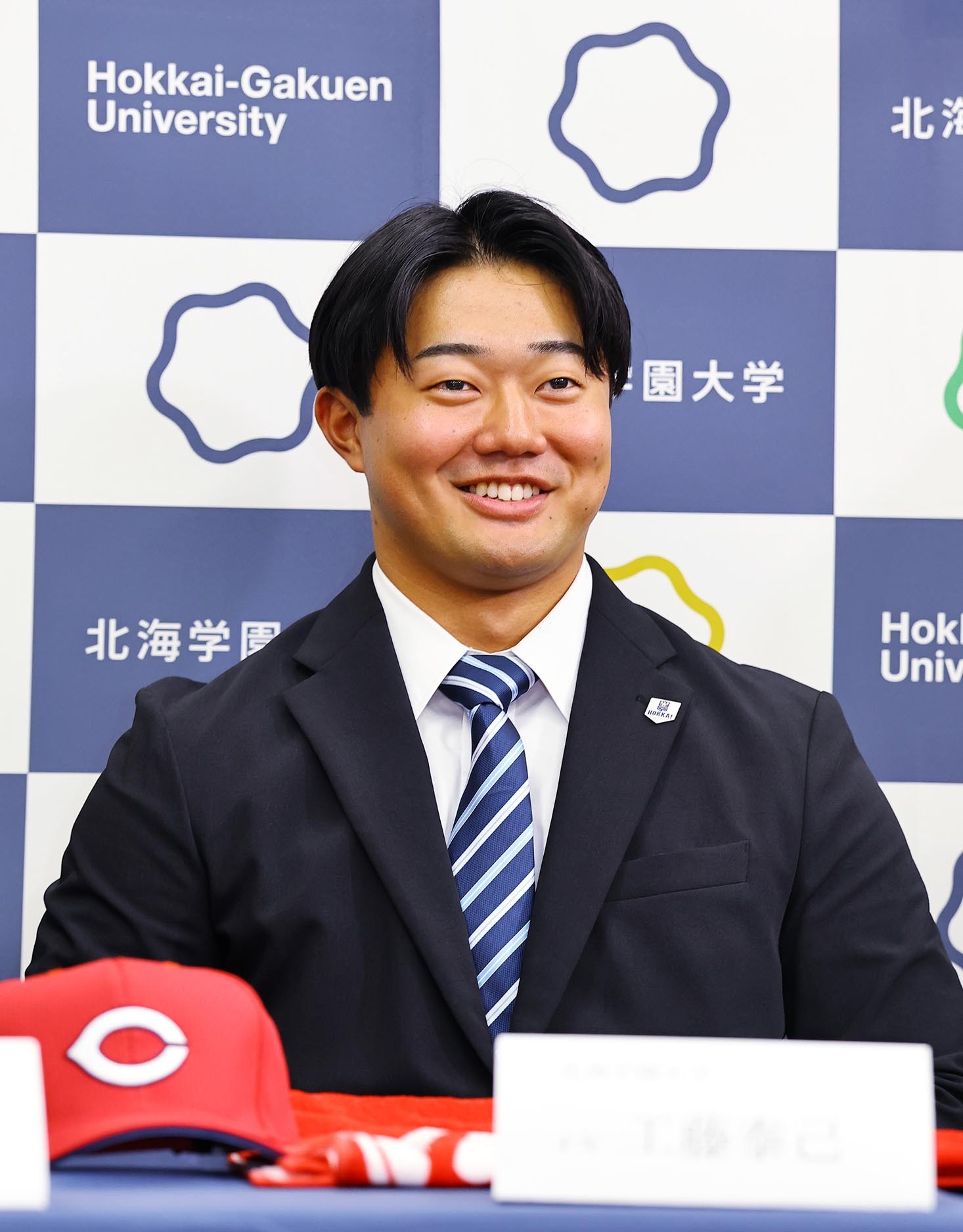 北海学園大プロ注目カルテットで、一番最初に呼ばれたのは工藤だった。同大の会場では大きな拍手が響き渡り、島崎圭介監督(54)とがっちり握手を交わした。この日の午前中もルーティンのウエートトレーニングでパンプアップしてから会場へ。「まさかカープとは思ってなかったので、びっくりした気持ちはありましたけど、シンプルに嬉しい気持ち。(広島の印象は)スタジアム全体が真っ赤で、チーム全体が熱いチーム」。中学でもチームメートだったオリックス5位指名の高谷舟投手と、喜び合った。