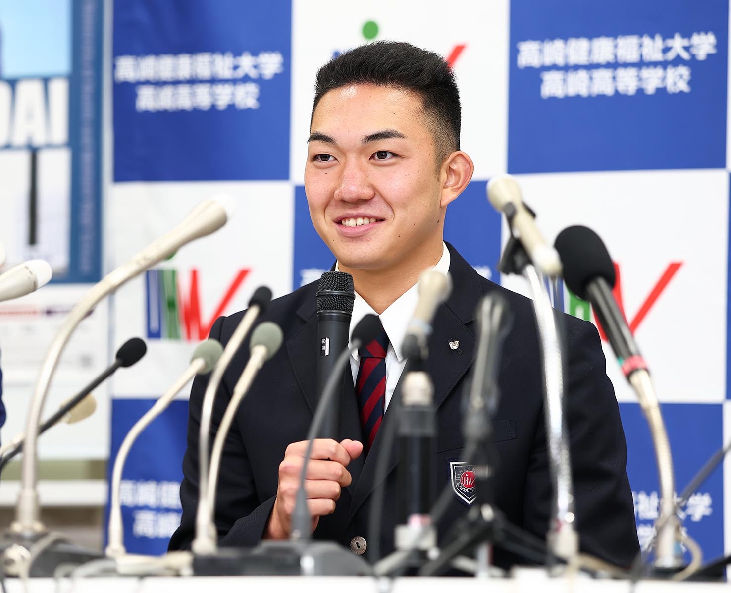 ロッテから1位指名を受け、笑顔で会見に臨む健大高崎高の石垣