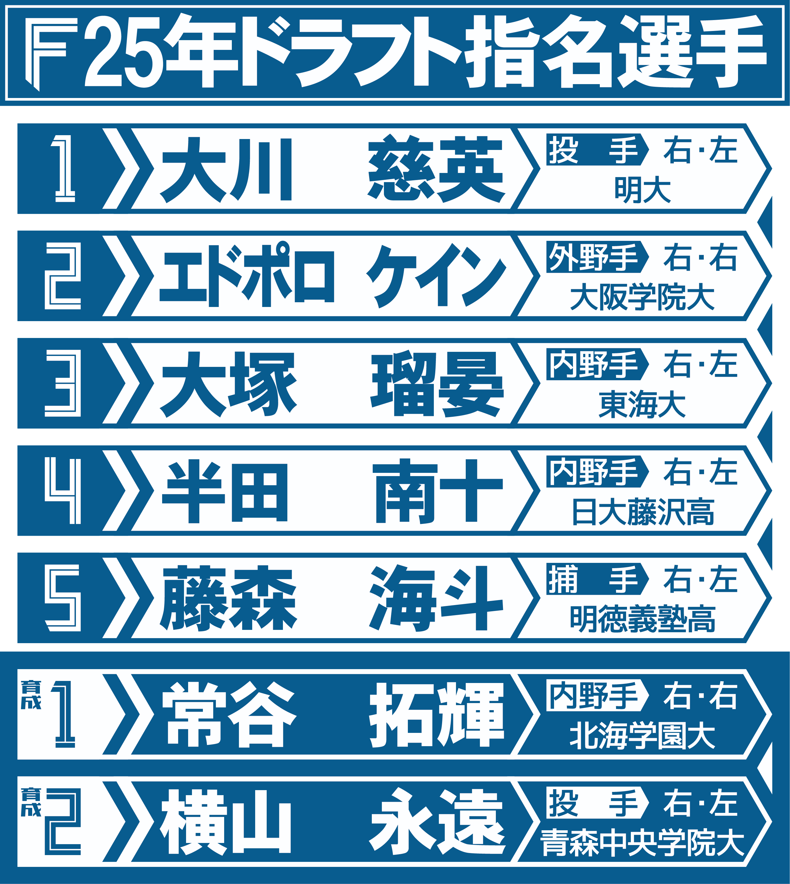 日本ハムは7選手の交渉権を獲得した。1位指名で2度競合し、続けてくじを外したが、3度目に最速155キロ右腕の大川慈英投手(明大)を指名。支配下の内訳は投手1人、捕手1人、内野手2人、外野手1人で、育成は投手と内野手が1人ずつとなった。