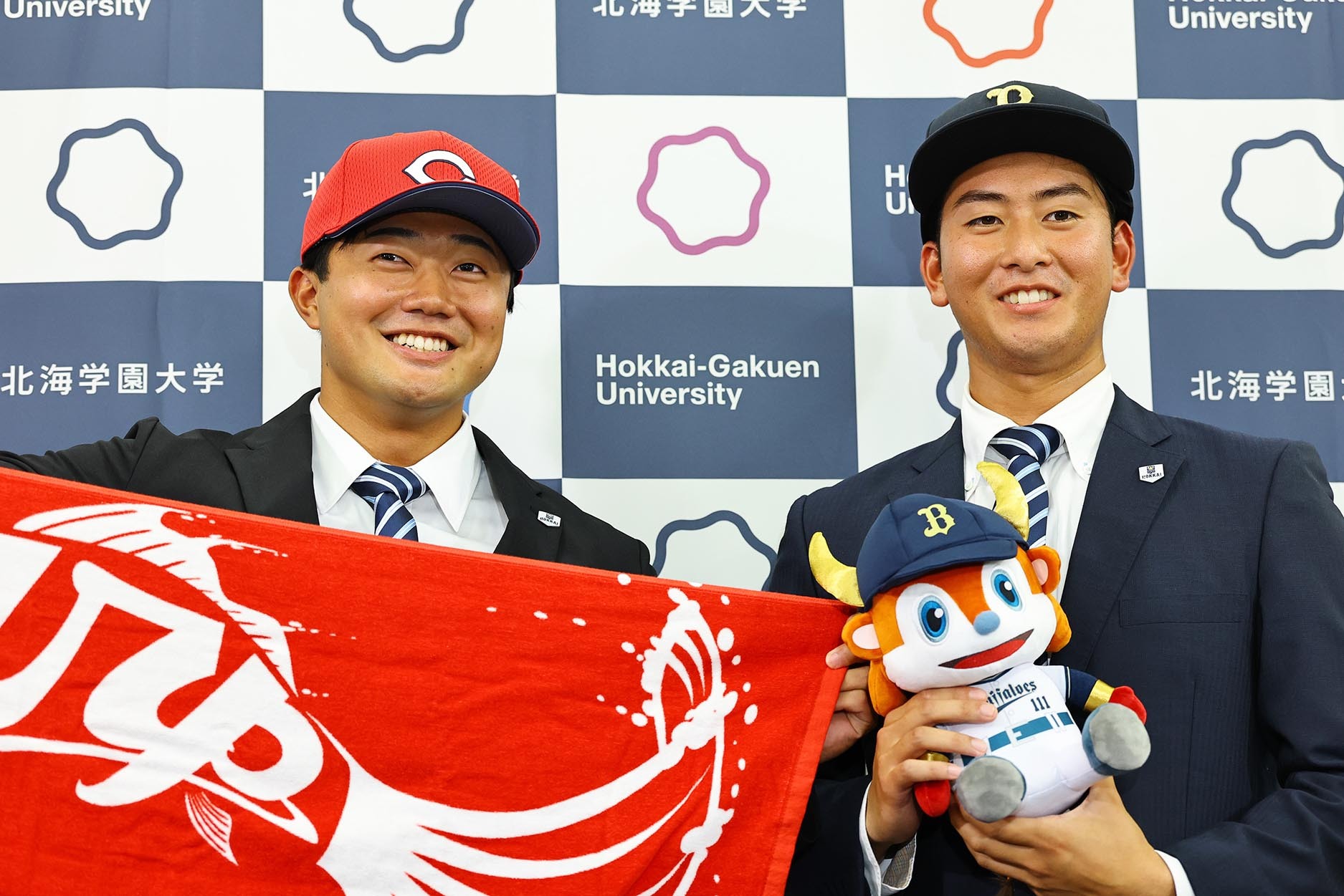 広島4位指名を受けた工藤(左)とフォトセッションに応じるオリックス5位指名の高谷