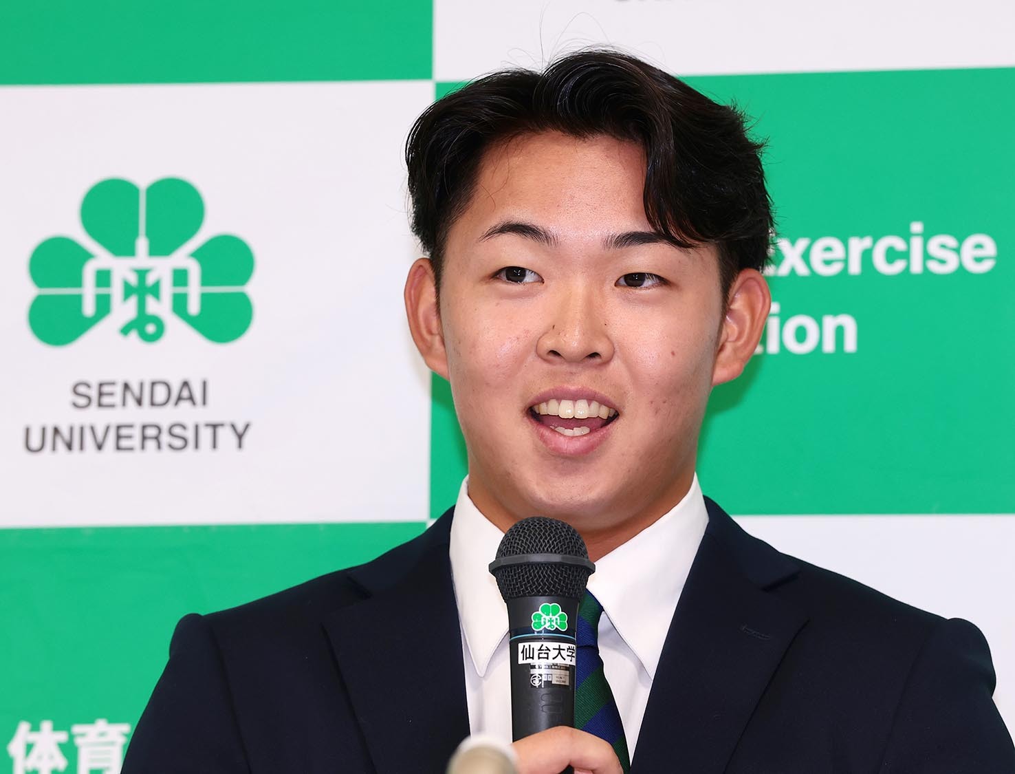広島に1位指名され、会見でプロへの思いを話す仙台大の平川