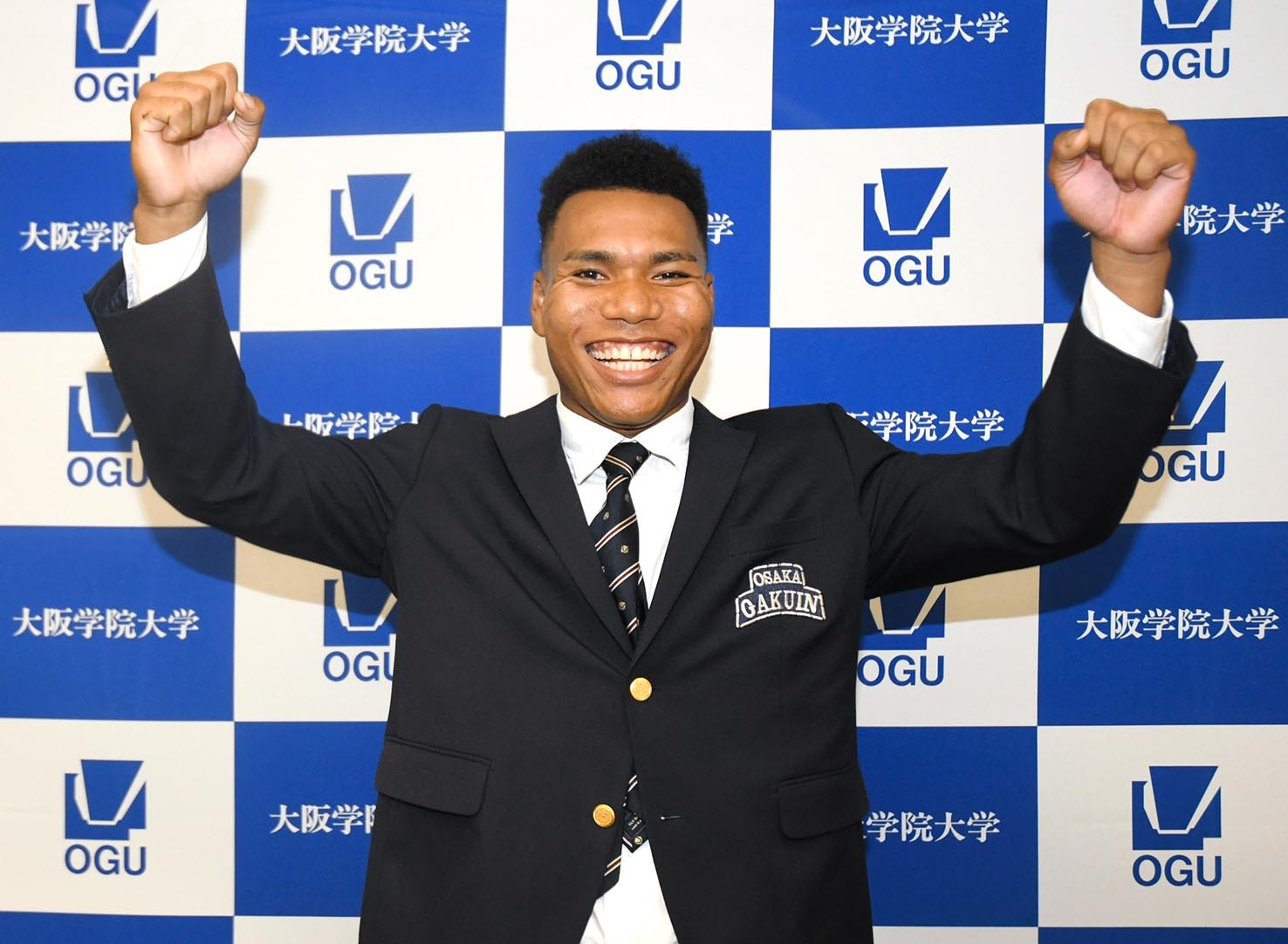 日本ハムに2位指名され、ガッツポーズする大阪学院大のエドポロ・ケイン