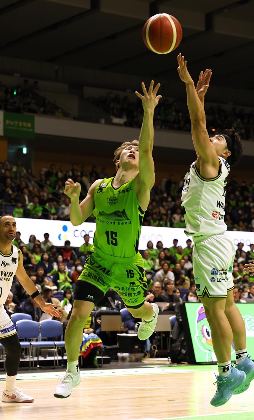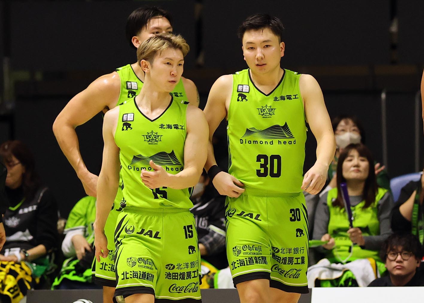 東地区5位だったレバンガ北海道はゲーム差1で追いかけていた仙台との直接対決を制し、3位に浮上した。道産子PG島谷怜(25)がチームトップの5アシストと勝負所での2得点で勝利を引き寄せた。3点ビハインドの第4クオーター(Q)残り3分から、SG/SFドワイト・ラモス(27)へのアシスト、そして自らの得点で逆転に成功。チームはそのまま終盤の競り合いを87-85で勝ちきり、今季2度目の2連勝。通算5勝3敗とした。また、日本代表SG富永啓生(24)は前半に相手の激しいマークに得点を伸ばすことができず、移籍後最少の6得点にとどまった。