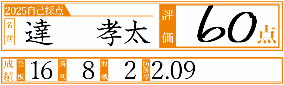 「何点ですかねー。でも、60点ぐらいじゃないですか。序盤、うまくポンポンポンと勝てて、そこからずっと勝てなくて。勝てなかった時期は、今振り返ったら、やっぱり欲がありましたね。欲が出ました。その欲は、良くなかったなって、めっちゃ思いますね。投げていても、そっち(白星を挙げること)が目標になってしまっていて、何かちょっと、方向性がズレているなというのは感じていましたね」