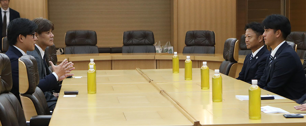 オリックスの山口スカウトグループ長(左奥)らから指名あいさつを受けた北海学園大の高谷(右手前)と島崎監督(右奥)
