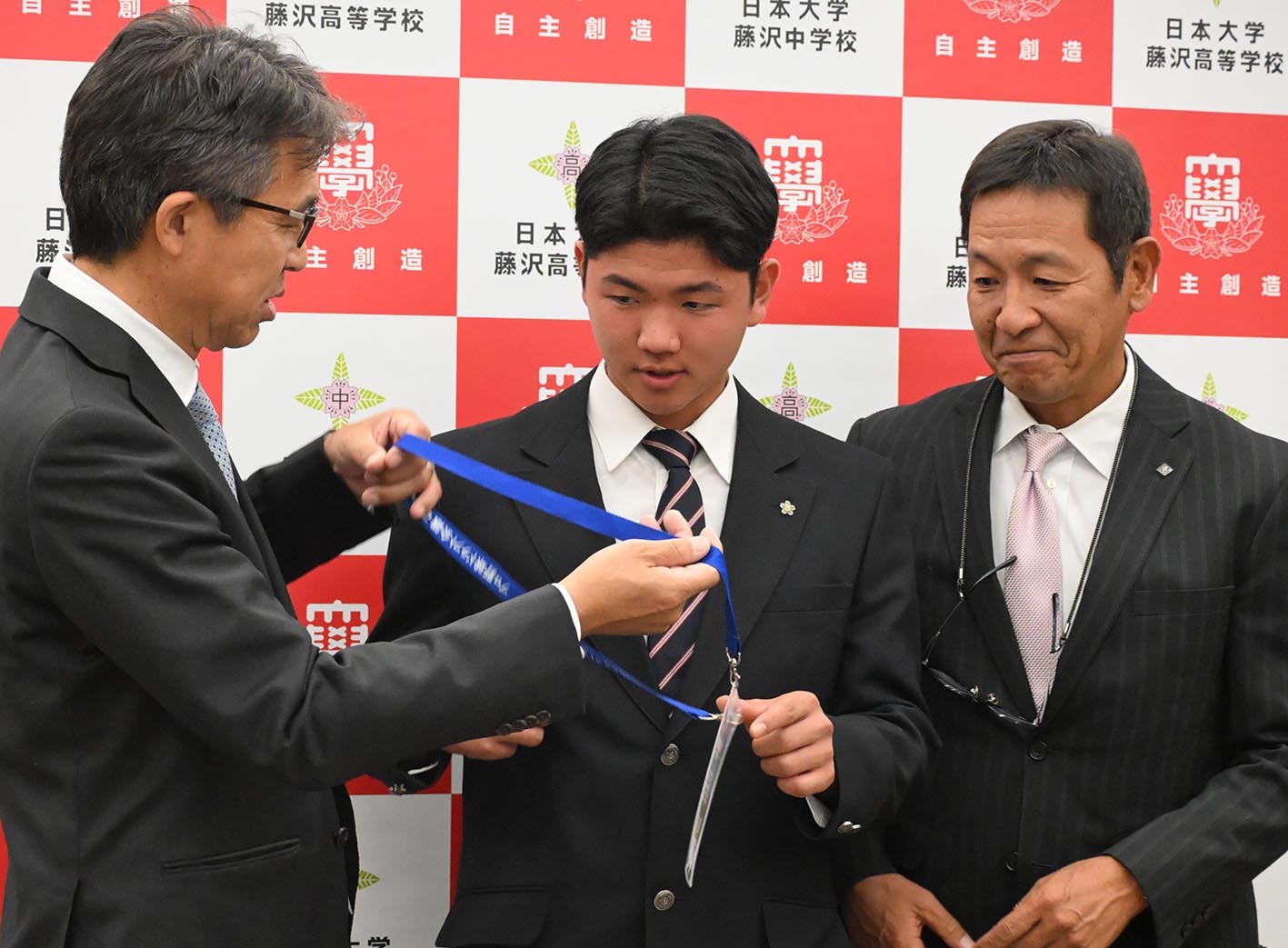 大渕スカウト部長(左)、坂本スカウト(右)と記念撮影する半田=撮影・近藤裕介