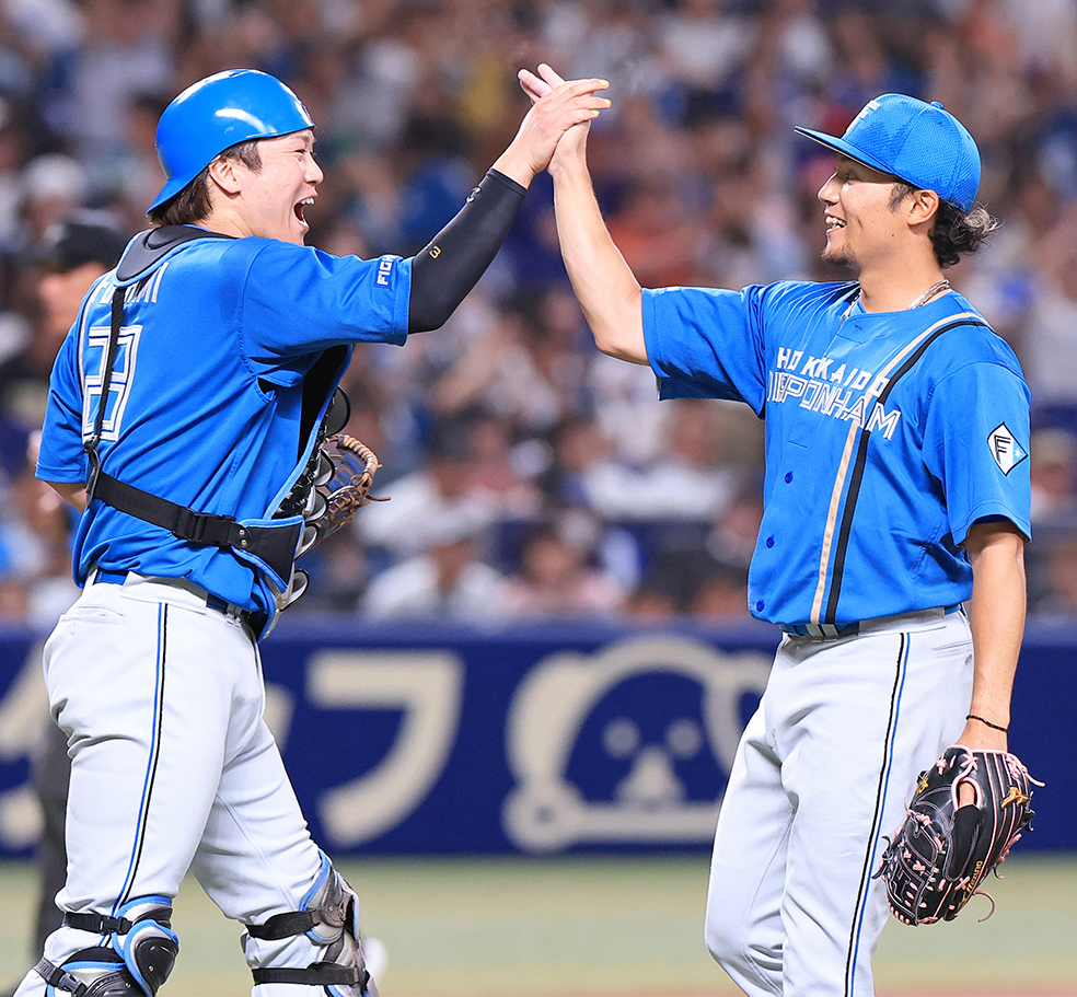 6月20日の中日戦、完封勝利し、笑顔でハイタッチする〝ひろとら〟コンビの伏見(左)と伊藤