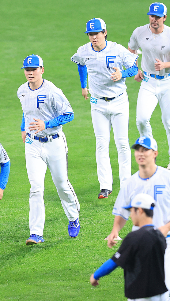 秋季キャンプがスタートし、並んでアップをする清宮(左)と北山(中央)