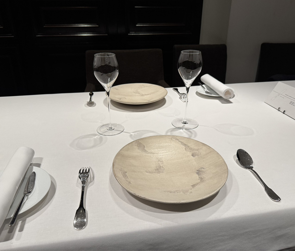 二人が訪れた高級フレンチ店のテーブル=本人提供