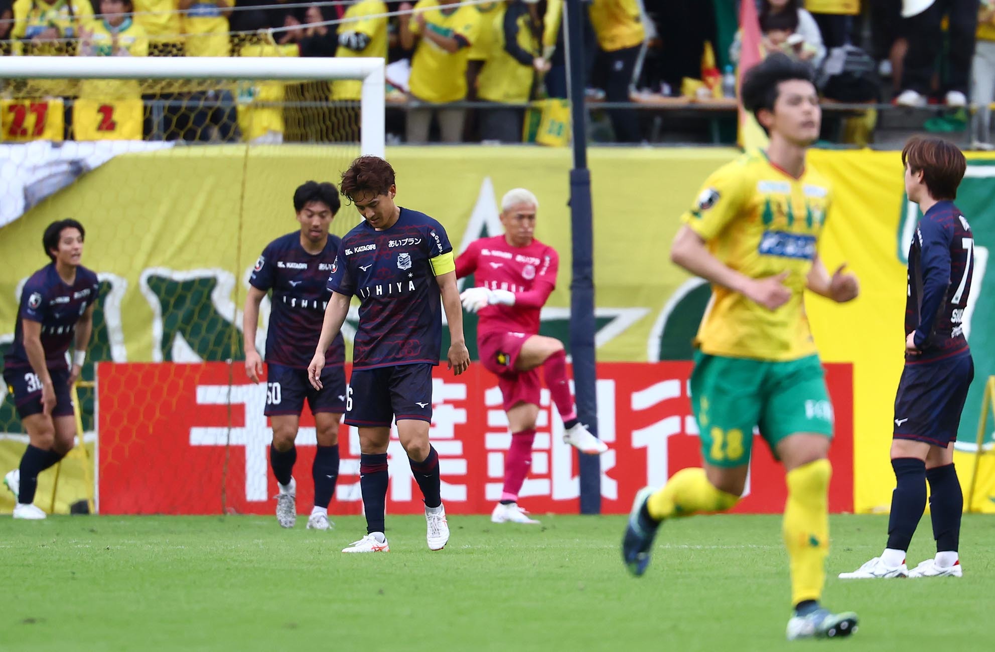 後半40分、千葉のFW呉屋に5点目を奪われ、肩を落とすMF高嶺主将(中央)ら札幌の選手たち