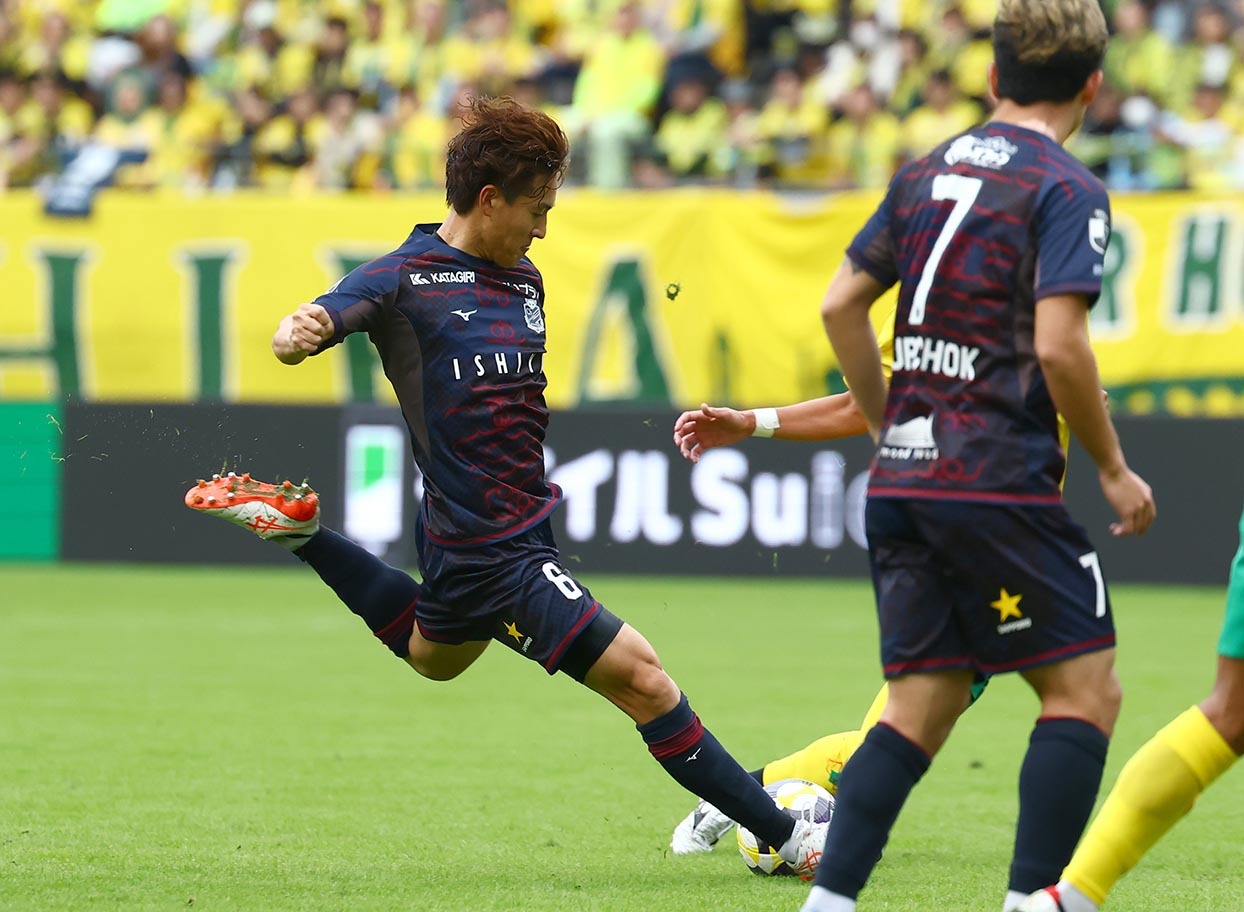 後半、ミドルシュートを放つMF高嶺(左)