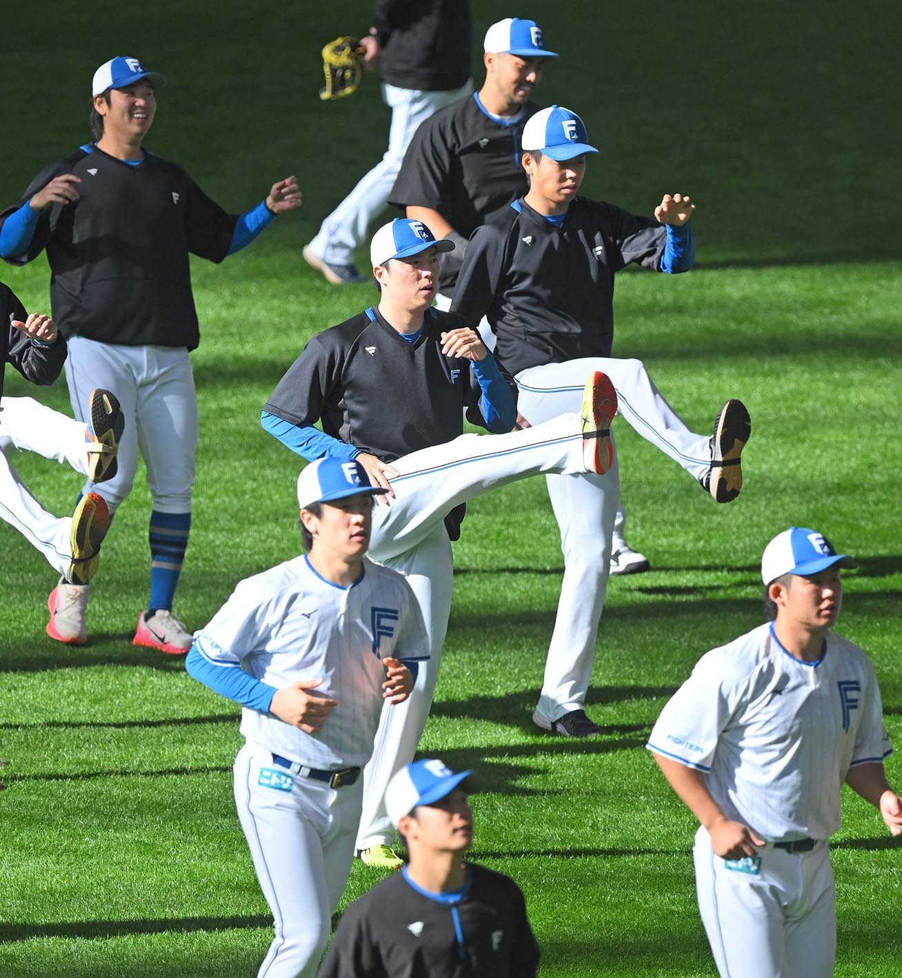 秋季キャンプでアップをする田中(中央)
