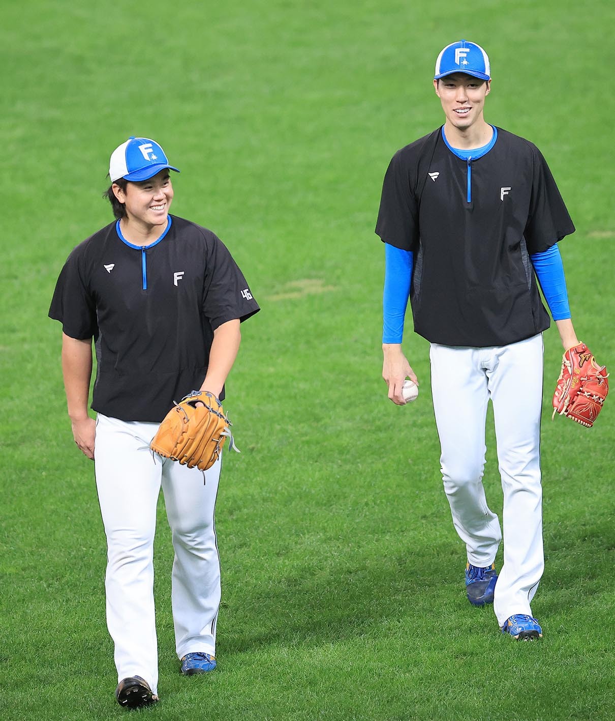 キャッチボールを終えた畔柳(左)と福島