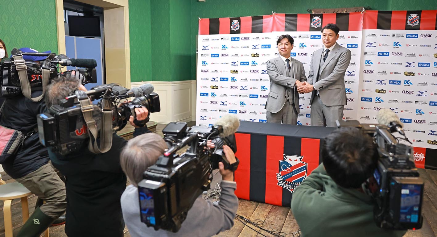 石水社長「シーズンを通した中で、他のスタッフや全国のJクラブの人と対話を重ねる中で、GM職はどのような人が適任か考えていた。竜二さんを選んだ理由は3つ。1つはクラブ愛。11年からコンサドーレのためにキャプテン、プレーヤーとして闘っていた。その闘う姿勢はクラブにマッチする人材。もう1つは人格者であること。周りのスタッフや選手、フロントの人に聞いても誰もが納得する。竜二さんなら大丈夫、付いていこうと思わせてくれる。最後に覚悟。私がGMをお願いしようと決めて電話したときに、2つ返事で『待っていました、クラブのために全力を尽くします』と言ってくれました。クラブ愛、人格者、覚悟。この3つが決め手になりました」