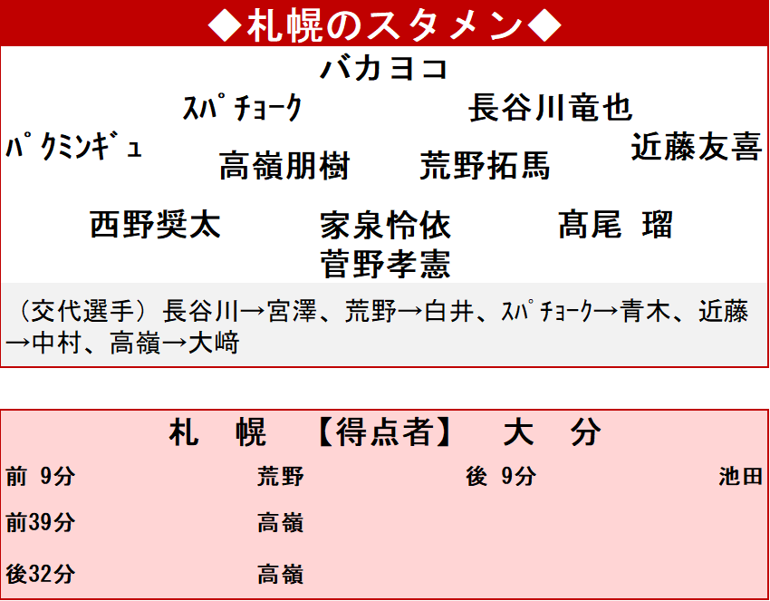 後半に入り、9分に大分に1点を返されたが、札幌も攻撃の手を緩めない。同27分に相手のゴールキックを跳ね返すと、FWアマドゥ・バカヨコ(29)がそのボールをダイレクトで相手DFの裏へボールを出し、予測して飛び出していた荒野へパス。荒野はそのままペナルティーエリア手前まで運んで右足シュートを放つも惜しくも左ポスト。直後の同分には、相手陣地左サイドのスローインの流れから左クロスを上げ、折り返しを再び荒野がシュートを放ったが、ここは相手GKのファインセーブに防がれた。