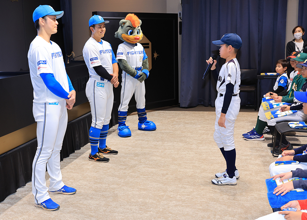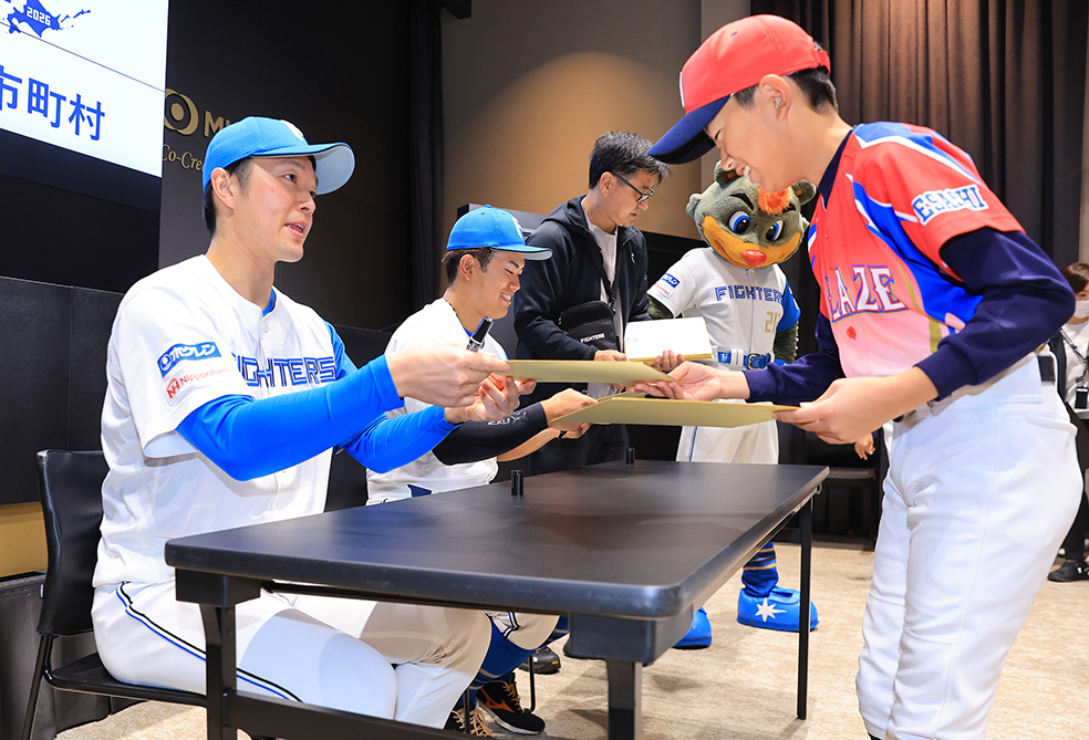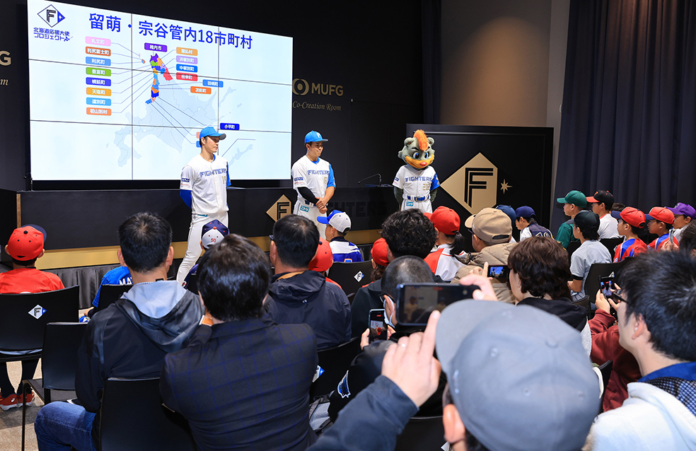 日本ハムの「北海道応援大使プロジェクト」2026年対象エリア発表セレモニーが9日、エスコンフィールド北海道で行われ、留萌振興局及び宗谷総合振興局管内18市町村で実施することが決まった。チームを代表して北海道佐呂間町出身の玉井大翔投手(33)と札幌市出身の今川優馬外野手(28)が出席。訪れた対象エリアの児童らと触れ合った。