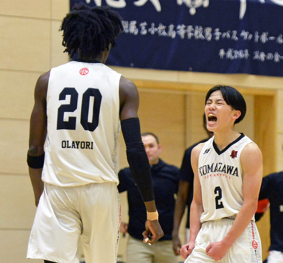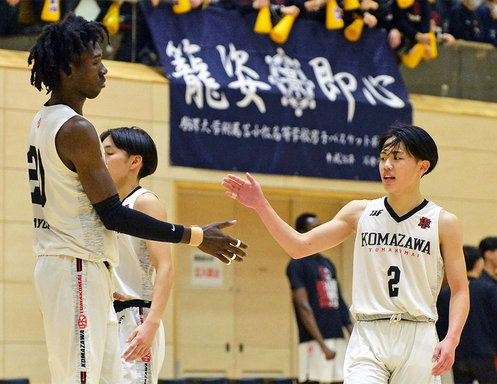 チームの得点を喜ぶ駒大苫小牧のPG宮森(右)