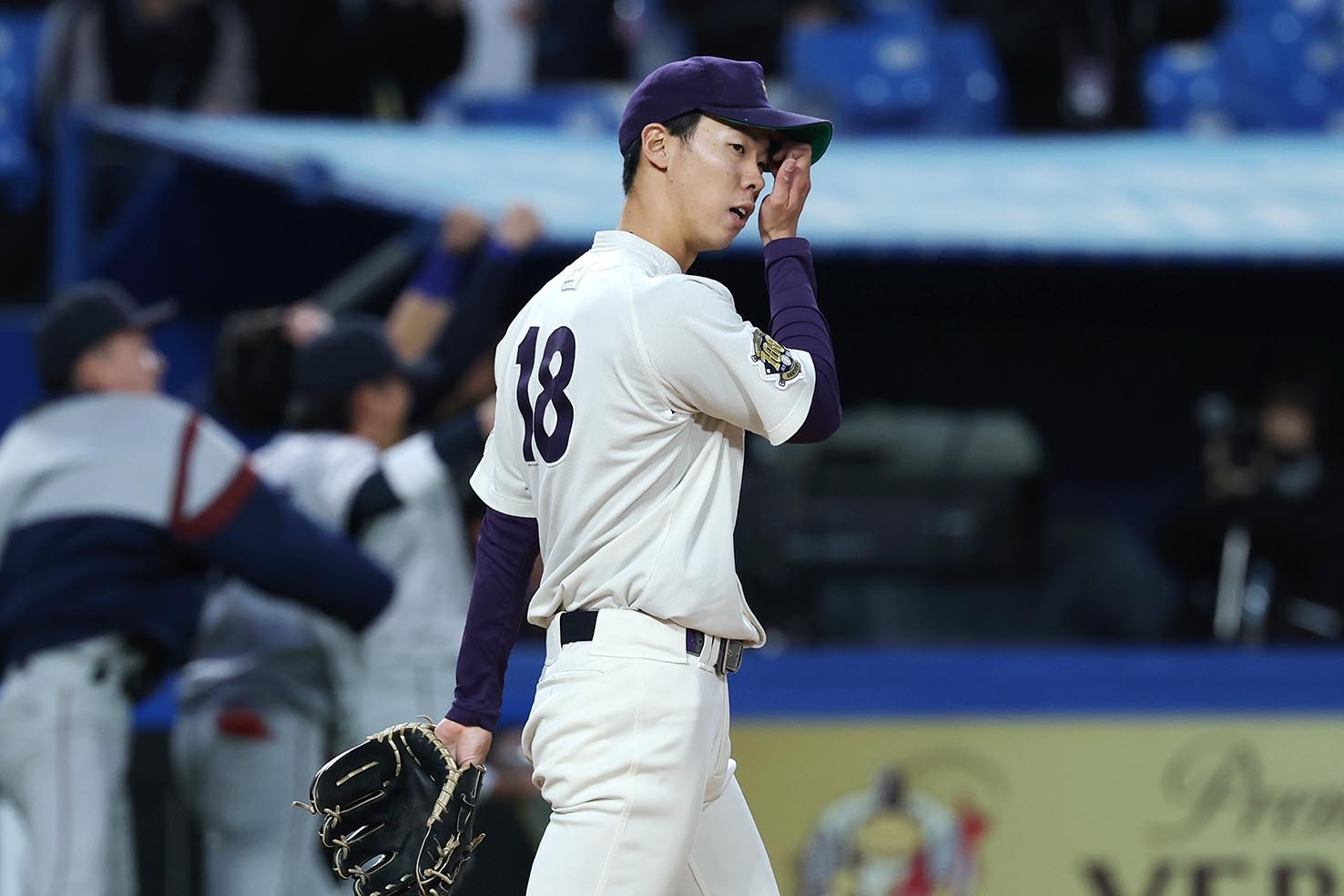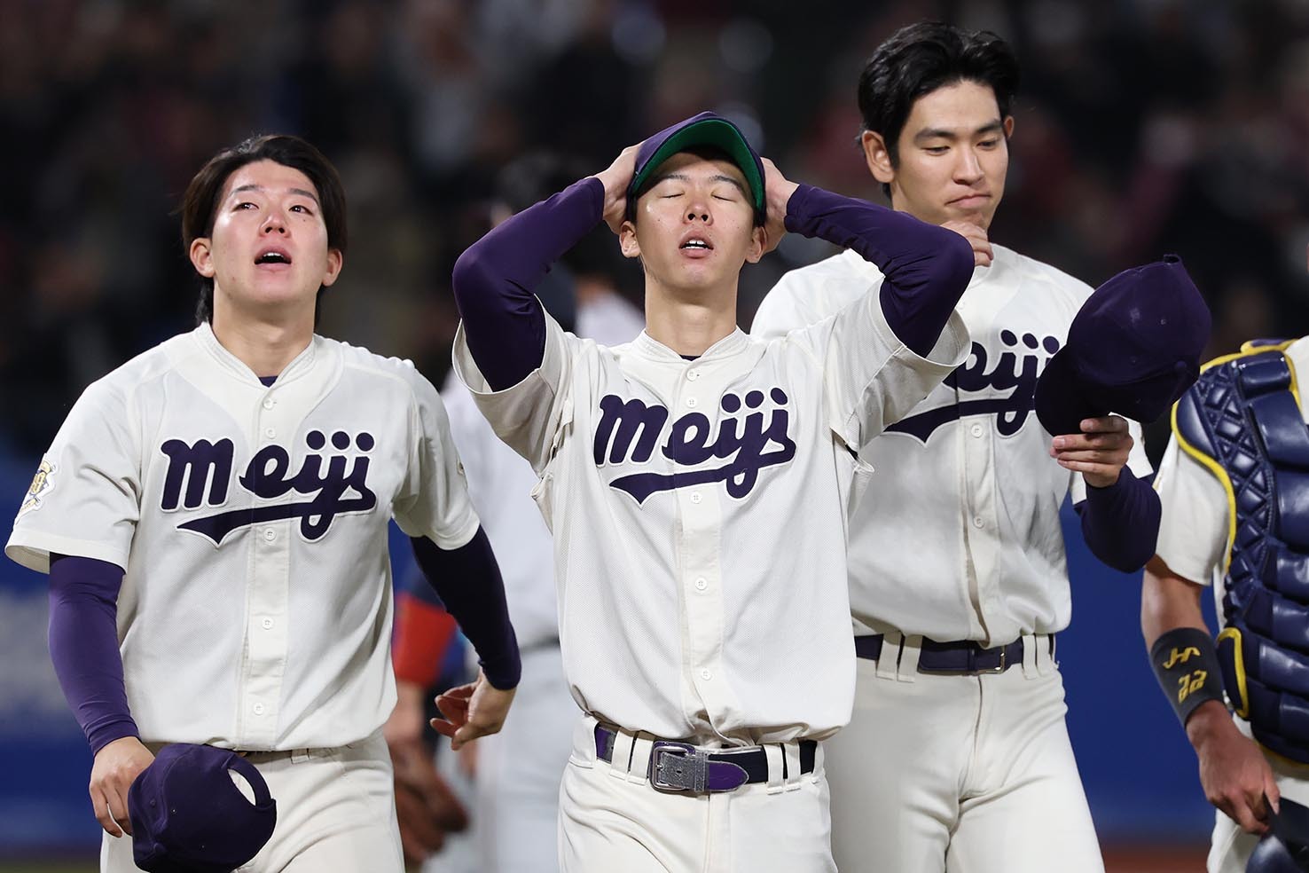 最後は、力尽きた―。日本ハムからドラフト1位指名を受けた大川慈英投手(4年、明大)は、同点の八回に3番手でマウンドへ。九回までは完璧な投球を見せていたが、タイブレークとなった延長十回に5失点を喫し、大学野球最後の試合を終えた。