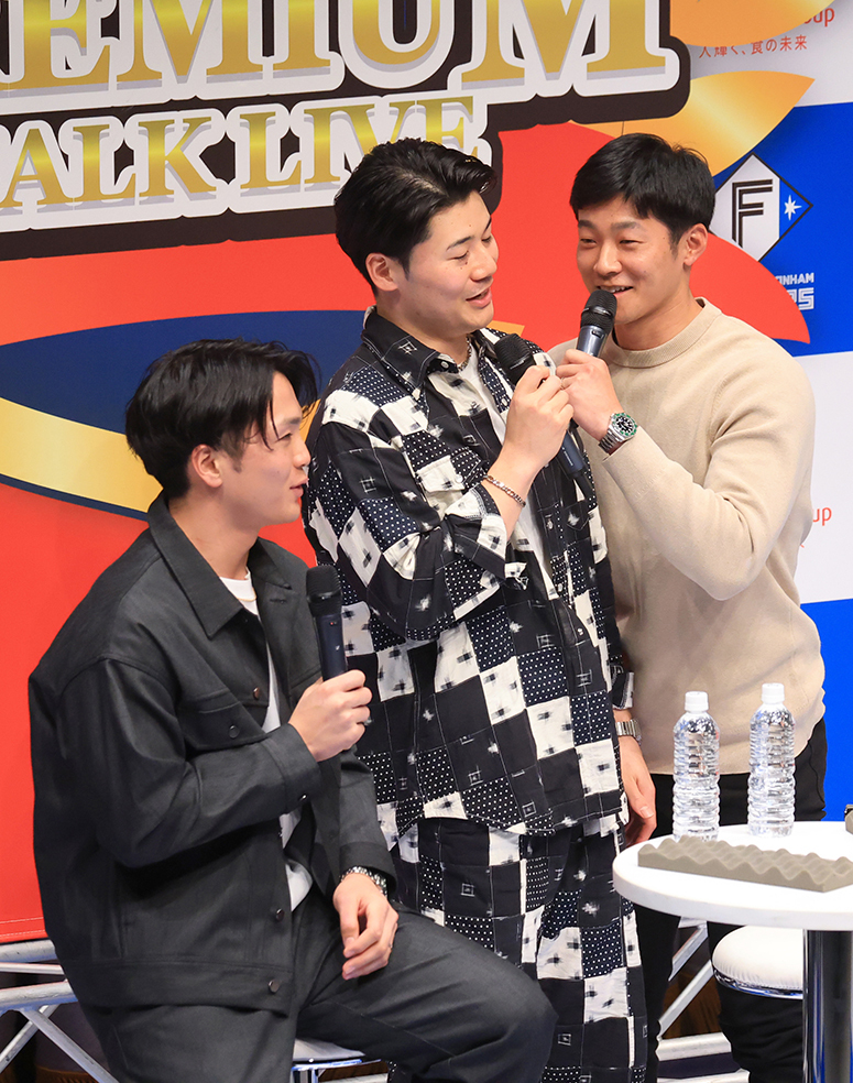 ファンからの質問コーナーでは、「エスコン内での秘密のパワースポットは?」の問いにそれぞれが答えた。清宮幸は今夏のオープン時〝寿司職人・清宮函太郎〟に扮してPRした「函太郎」。郡司は自身のプロデュースグルメを扱う「マンマパルマ」。石井は実家で生産した〝石井米〟の塩むすびを販売する「Yagien Ballpark」。それぞれ自身に縁のある店舗を紹介すると、上原が「セコくない!? マジでせこいよ。持ってんじゃん、ネタを!」と強烈なツッコミを入れた。そんな上原は、自身のファンという女性が名前を名乗ると「手紙、読ませてもらいました」とコメント。ファン思いな姿勢で、会場内に感嘆の声を響かせていた。