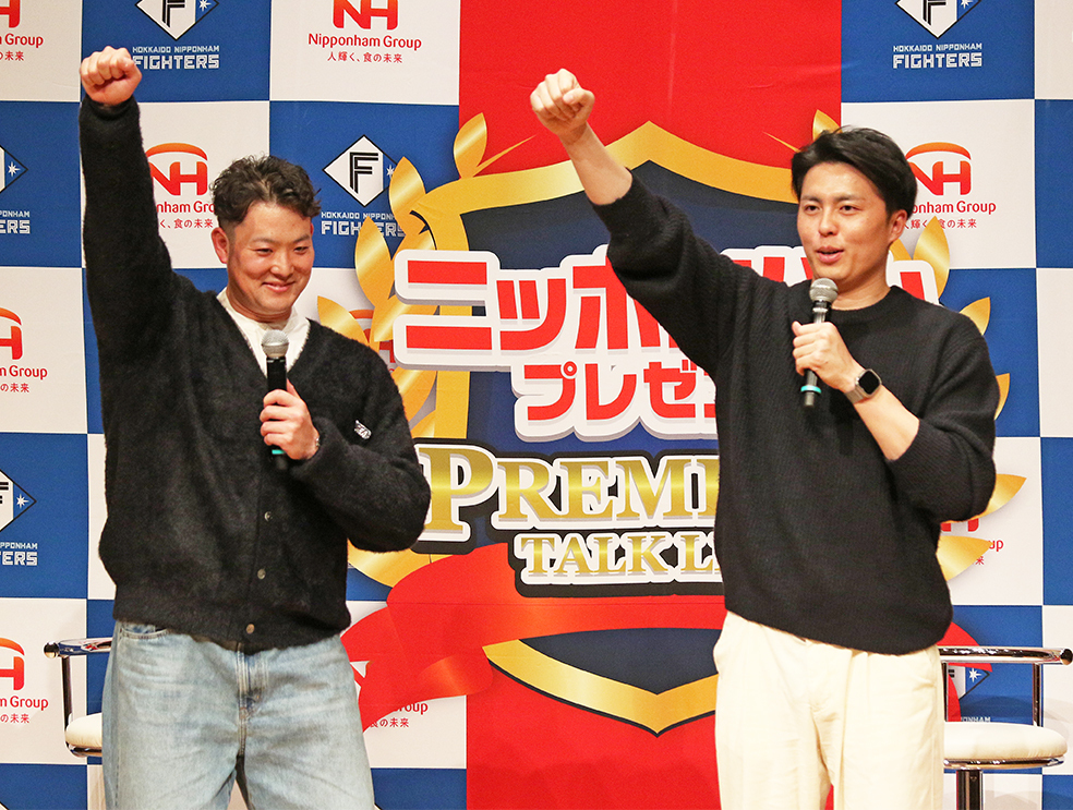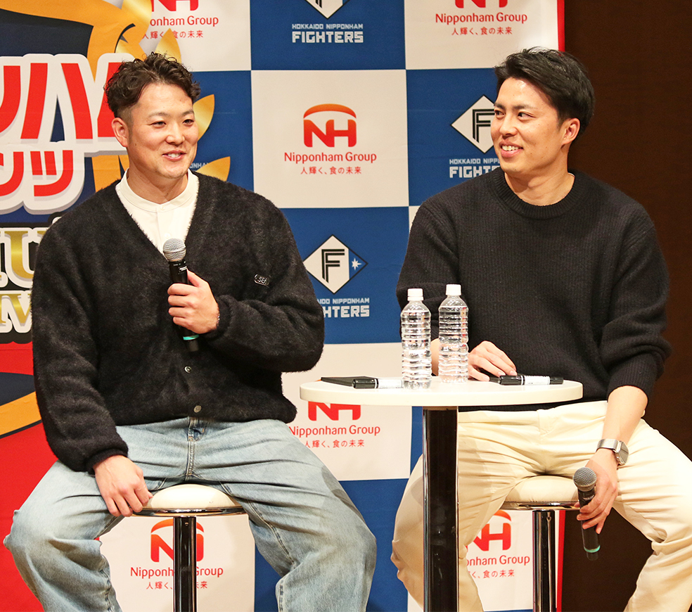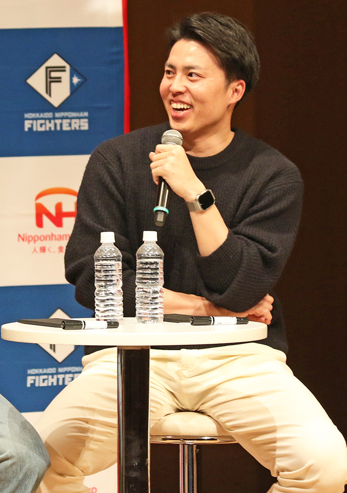 さらに、質問コーナーでは、本拠地・エスコンのブルペンで斎藤が電話を取っていたことについて「ブルペンの電話を選手が取ることがあるのか?」と問われた。これに対して、斎藤が「いつの試合か分からないんですけど、たぶん取る人がいなくて、自分〝北の電話番〟って言われているんですよ」と語り出し、田中は「初めて聞きました」と仰天。会場がざわつく中、「まだ下積みというか、電話を取ることからスタートなので。〝北の電話番〟と、〝北のドアマン〟とも言われています。ドアマンっていうのは正義だったり、走って(マウンドに)行くリリーフの方を送り出す。それで〝北のドアマン〟っということで」と続けた。