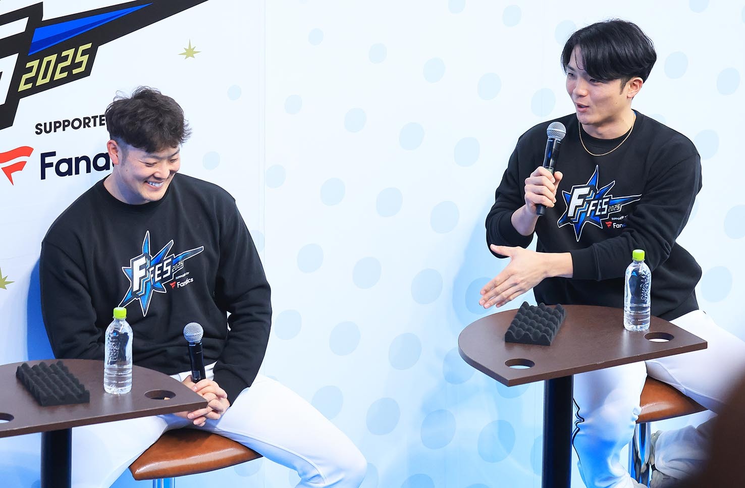 日本ハムの斎藤友貴哉投手(30)と郡司裕也捕手(27)がトークショーに登場。抜群の話術を持つユーティリティー捕手が、天然キャラで親しまれている右腕の〝通訳〟を務め、会場を爆笑に包み込んだ。