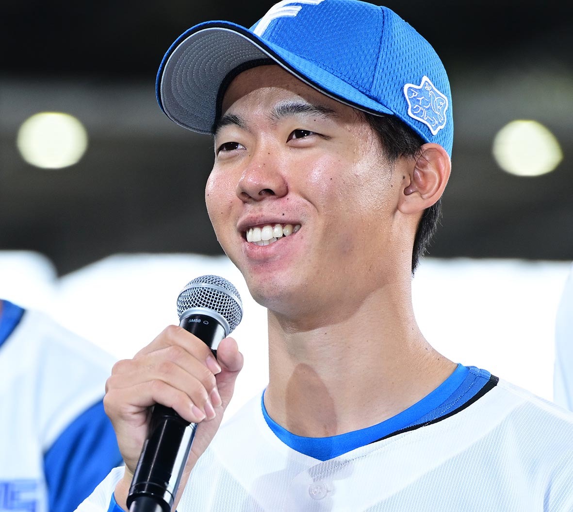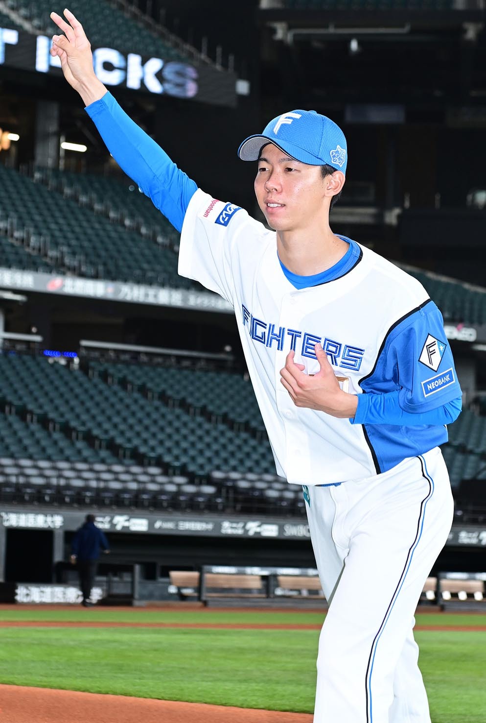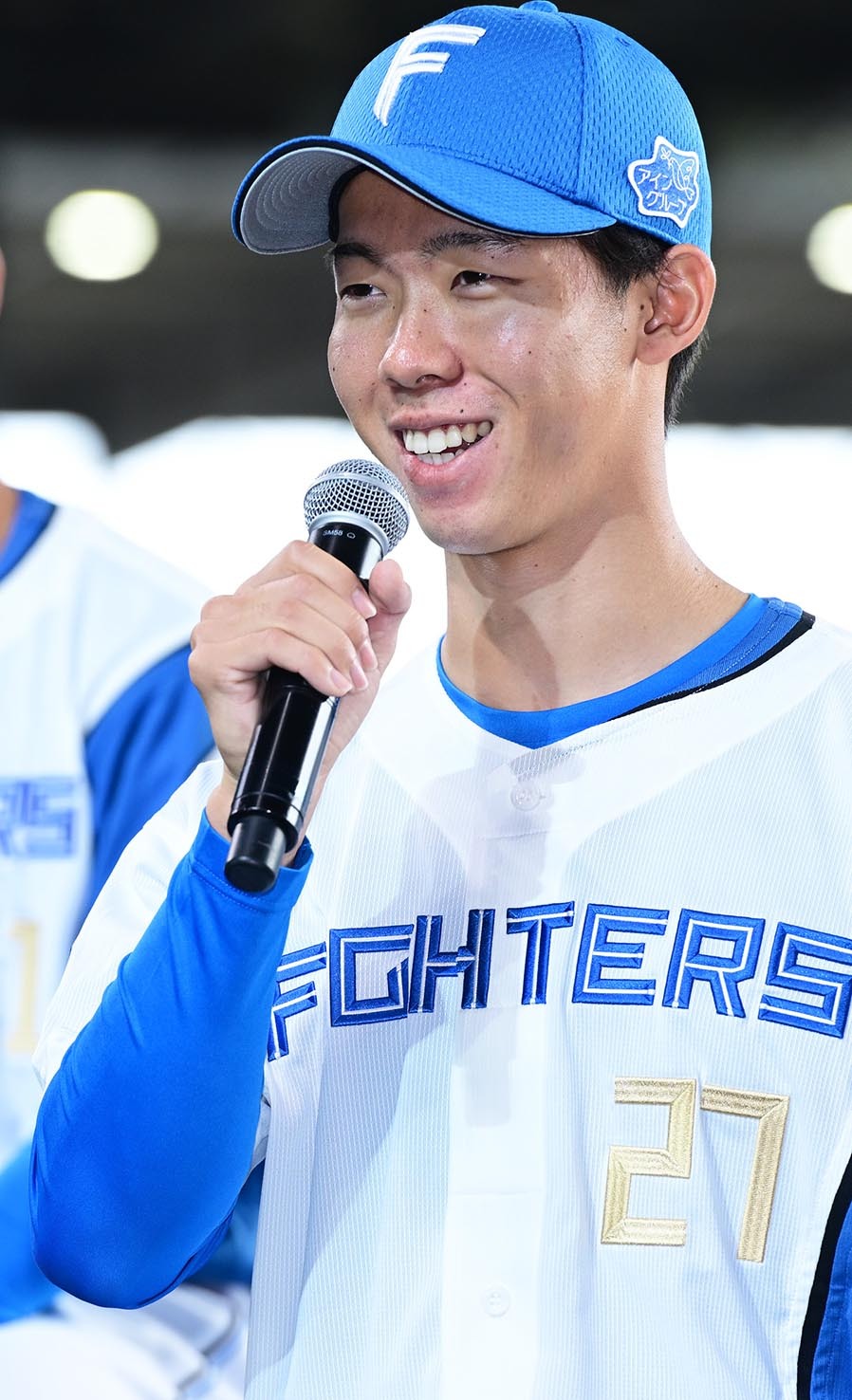日本ハムのドラフト1位・大川慈英投手(22)=明大=が24日、エスコンフィールドで行われた「新入団選手ウエルカムイベント」に出席し、背番号27のユニホーム姿をファンに初披露した。イベント後に取材に応じた一問一答は以下の通り。