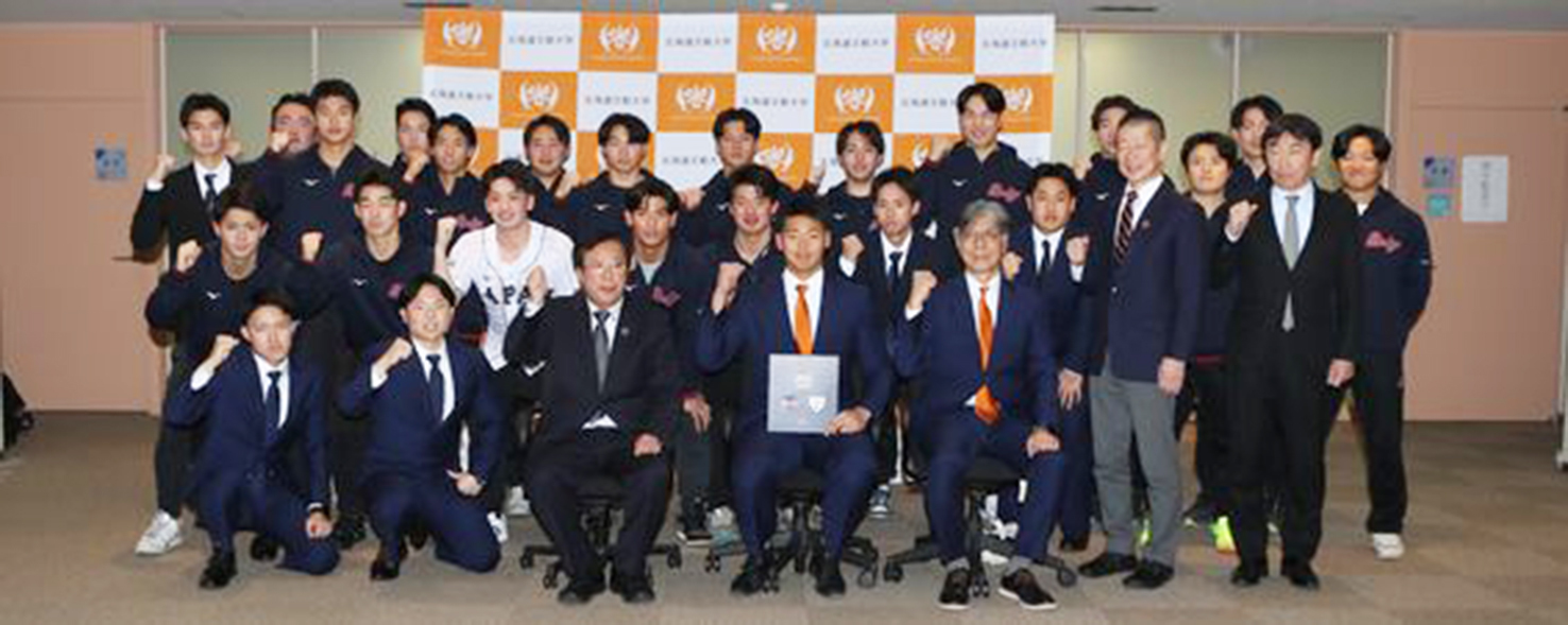 チームの同学年の選手たちに激励された北海道文教大の主砲・西浦(中央)
