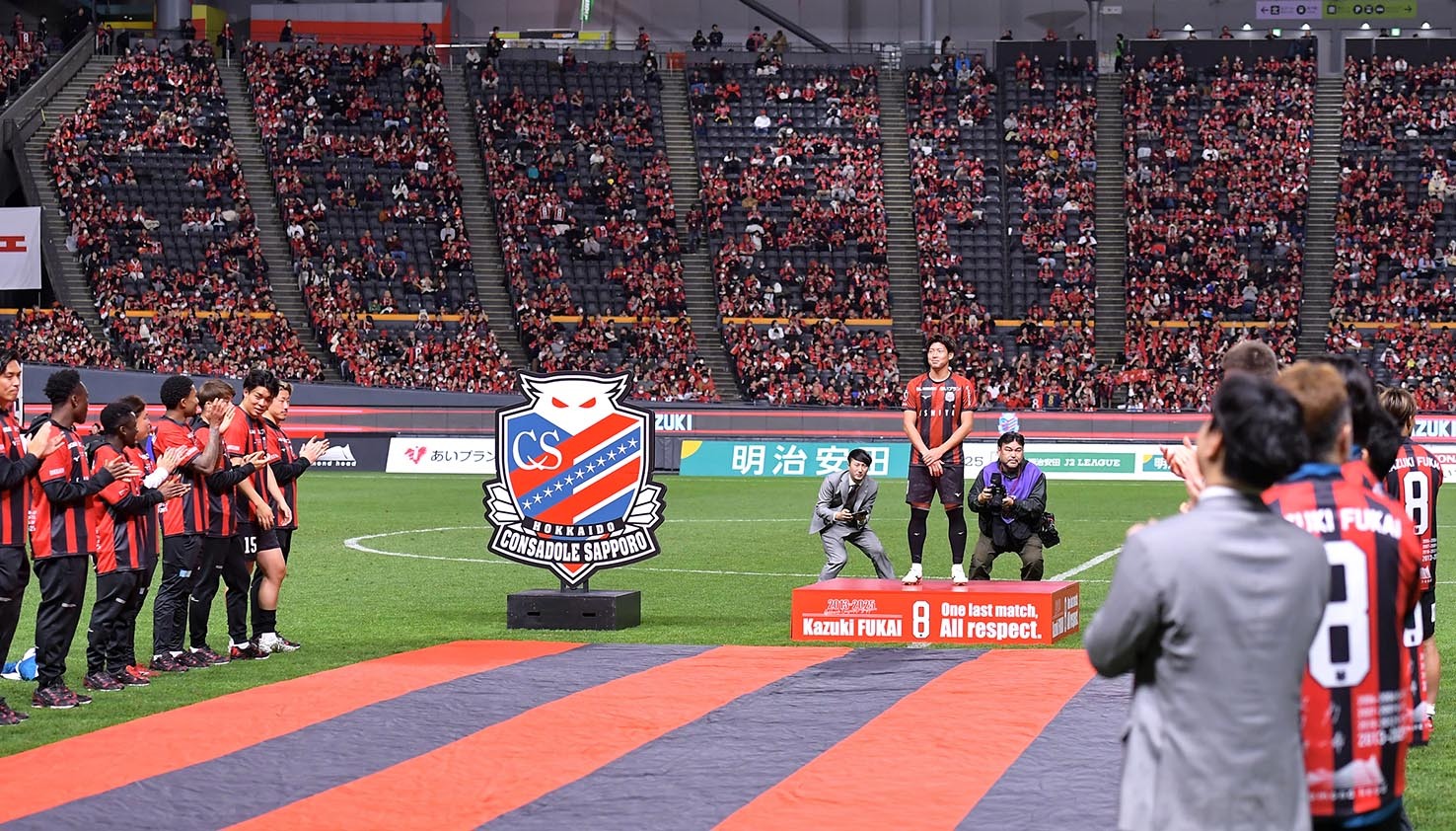 まず始めに、きょうこのような場を設けていただき、本当にありがとうございます。2025年北海道コンサドーレ札幌の最終戦、そして僕の現役最後の試合ということで、本当にたくさんの応援、ありがとうございました。愛媛FCのサポーターの皆さんも遠くから来てくださり、ありがとうございました。最高の雰囲気でサッカーを楽しむことができましたし、勝利を分かち合えてすごくうれしかったです。