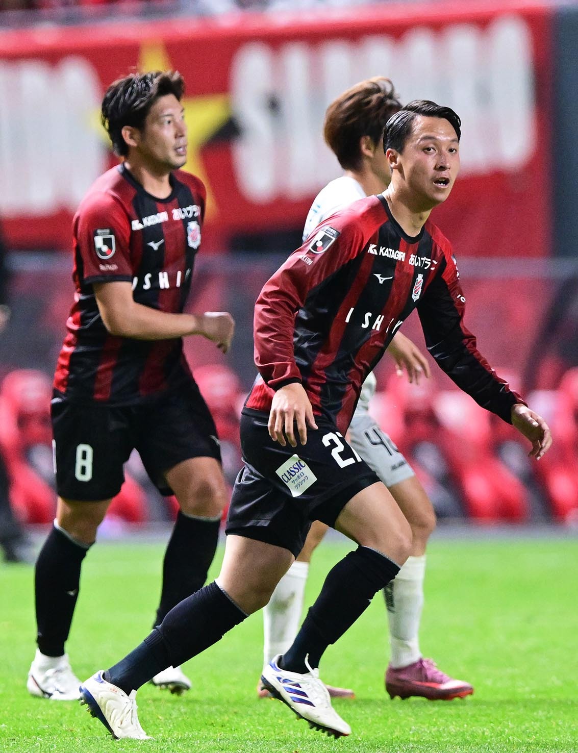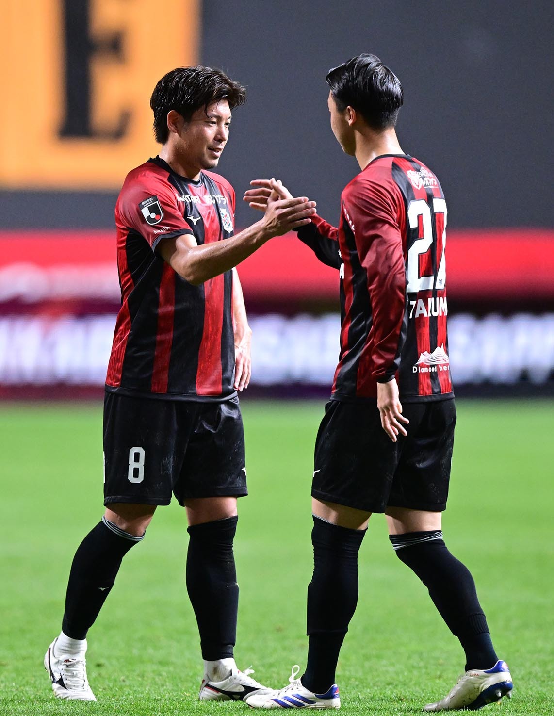 MF深井(左奥)の現役最後の試合で共にピッチに立ったMF荒野(手前)