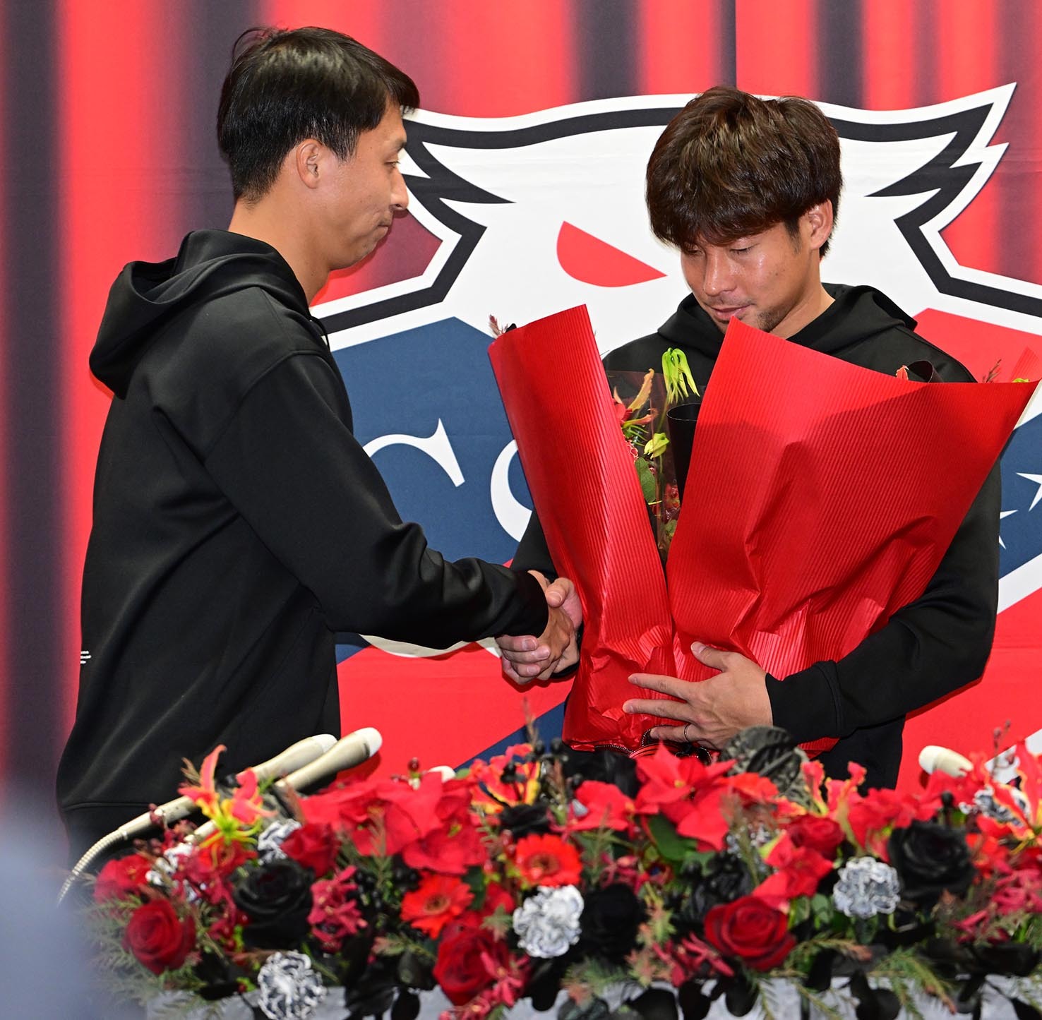 引退会見後、MF荒野(左)と握手を交わすMF深井