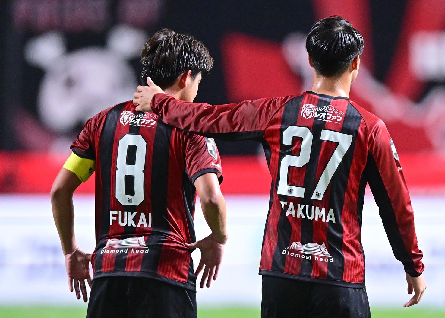 後半13分、ともに途中交代となったMF深井(左)とMF荒野が互いのプレーをたたえ合う