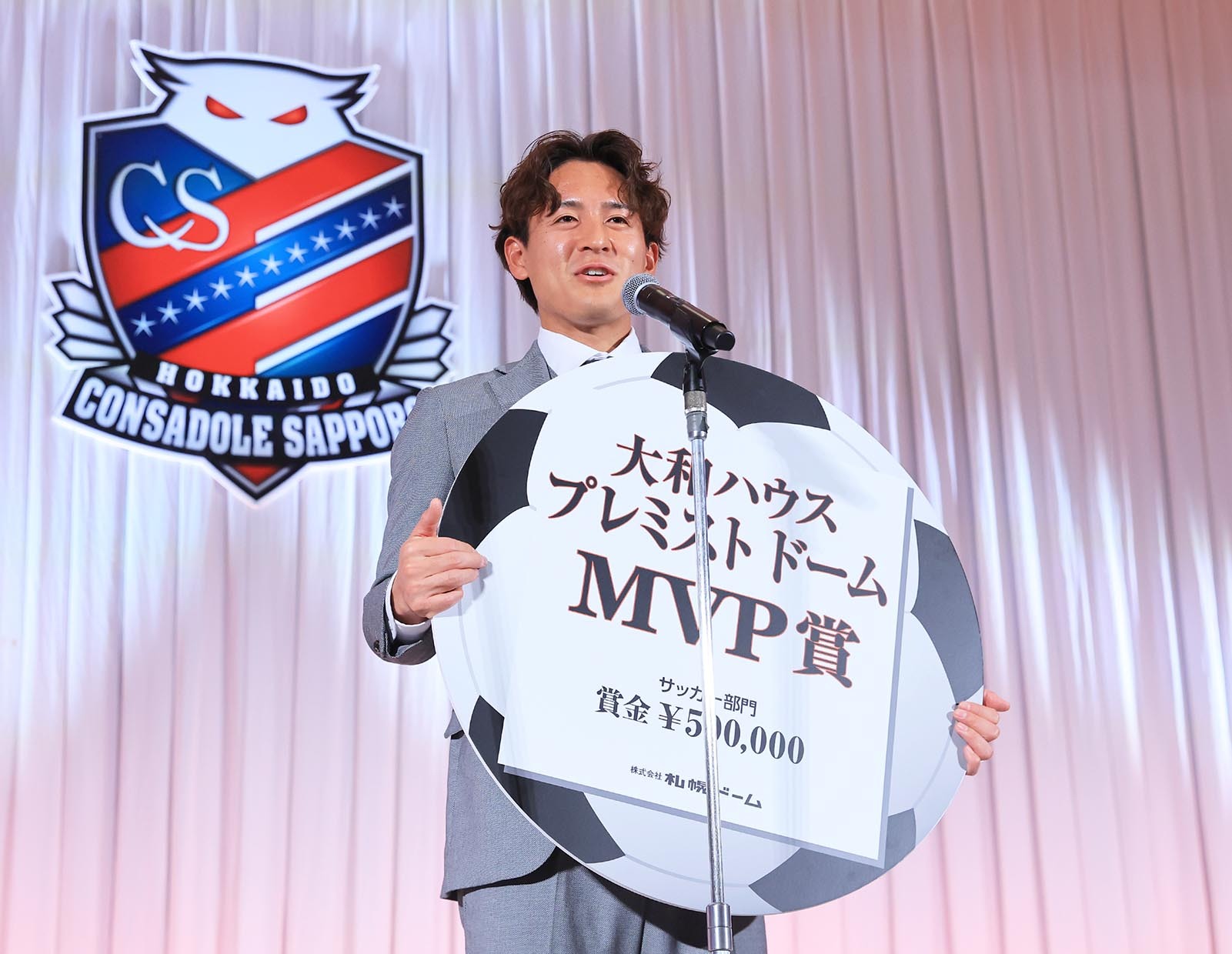 北海道コンサドーレ札幌は30日、札幌市内のホテルでパートナー企業を一堂に会して「感謝の集い」を行った。毎年恒例の大和ハウスプレミストドーム賞には、MF高嶺朋樹主将(27)が選ばれ、賞金50万円を受け取った。