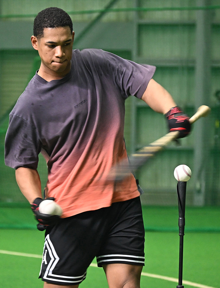 鎌ケ谷の室内練習場で打撃練習をする万波=撮影・近藤裕介