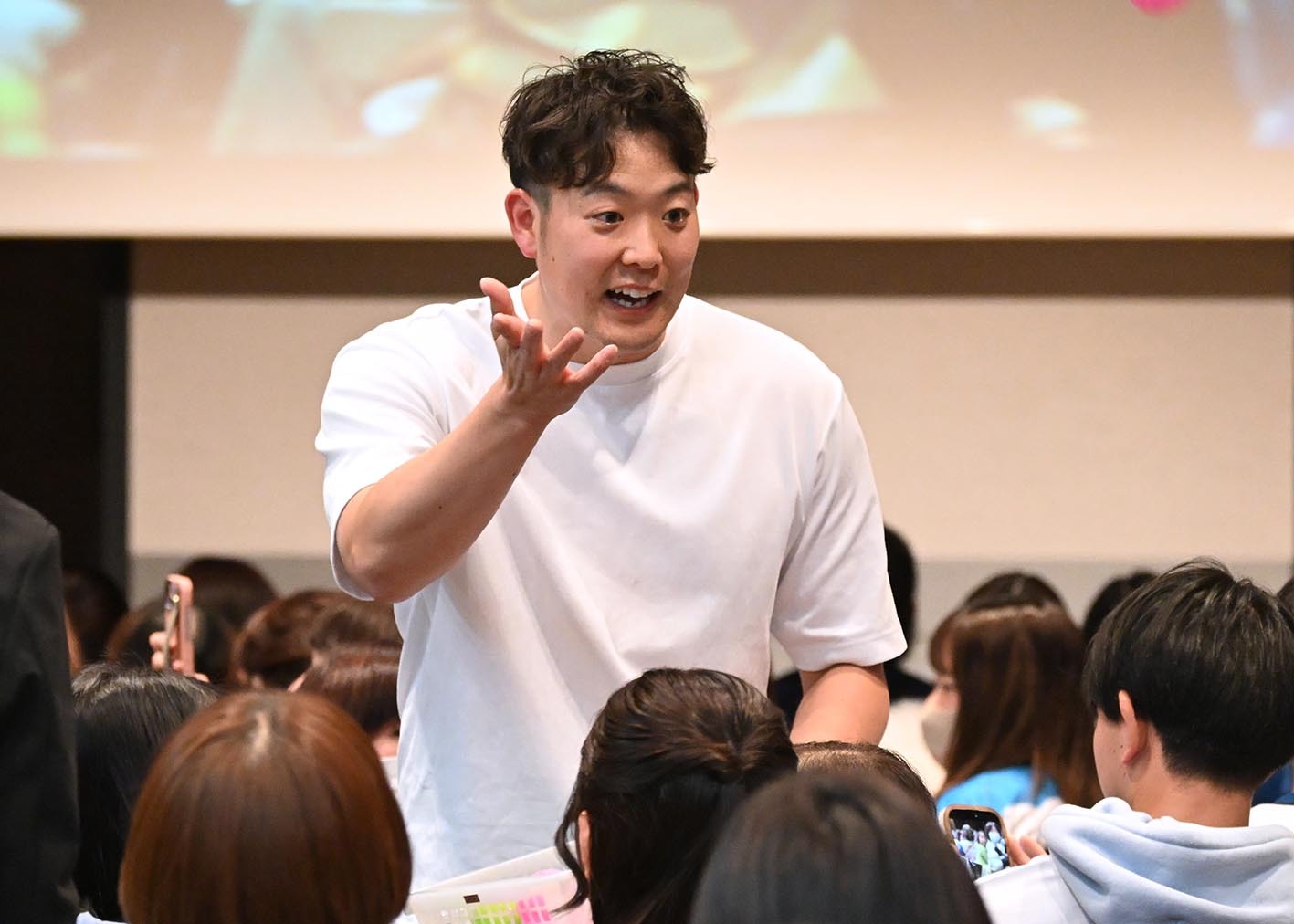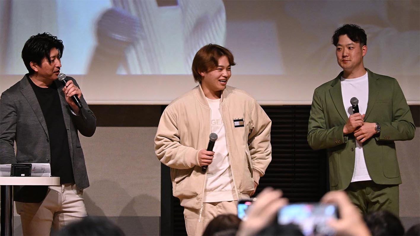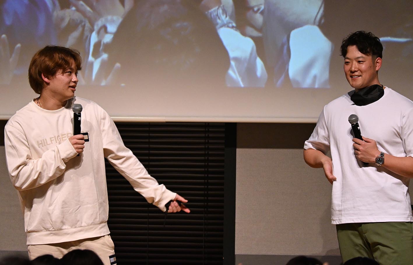 会場を大いに盛り上げた2人は、互いにリスペクトし合っている。田宮が「友貴哉さんのボールはすごいですよ。皆さんが見て分かるように、160キロを投げるんで、他のピッチャーより速いですし、フォークで150キロ投げますから」とたたえると、斎藤は思わず照れ笑いを浮かべ「田宮選手からも、チームメートからもあんまり褒められることないので、気持ちいいです。ありがとうございます」と喜んだ。