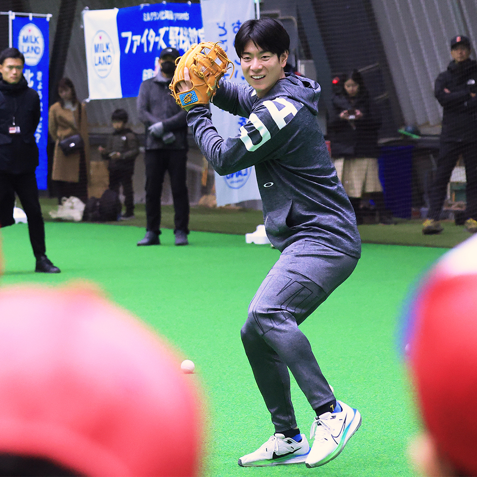 日本ハムの屋内練習場で行われたイベント。巨人移籍が決まっていることもあり、自分が参加していいのか葛藤もあった。「きょうは本当に正直、移籍前からこうやってオファーをいただいていて。ミルクランドさんからやりたいと言ってもらっていて。移籍したので、もしかしたらなくなっちゃうのかなと不安で球団の方に聞いて。それでもやってほしいと回答が返ってきたので、僕自身うれしかった」と率直な思いを口にした。