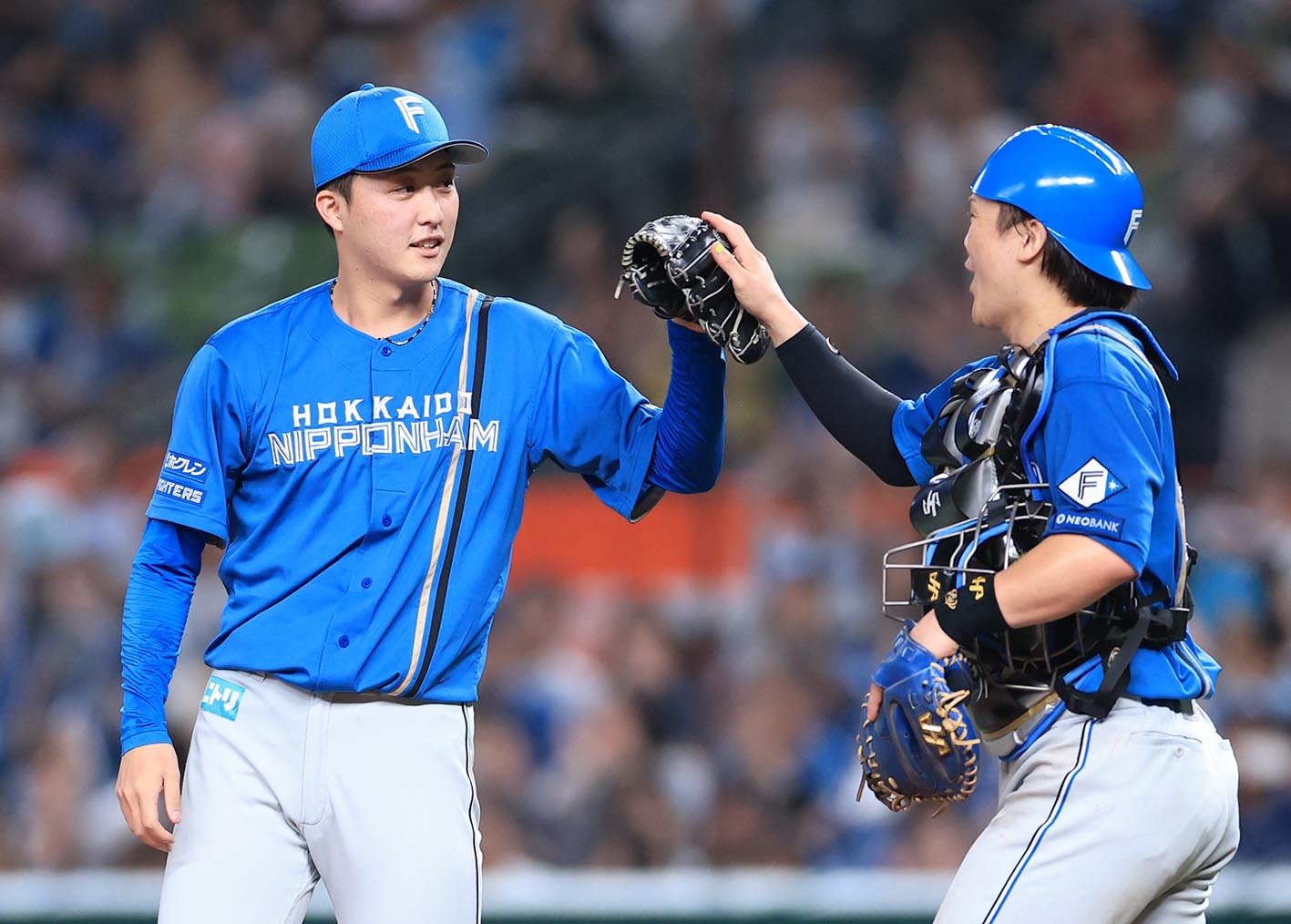 2024年8月7日の楽天戦でプロ初セーブを挙げた柳川(左)と伏見