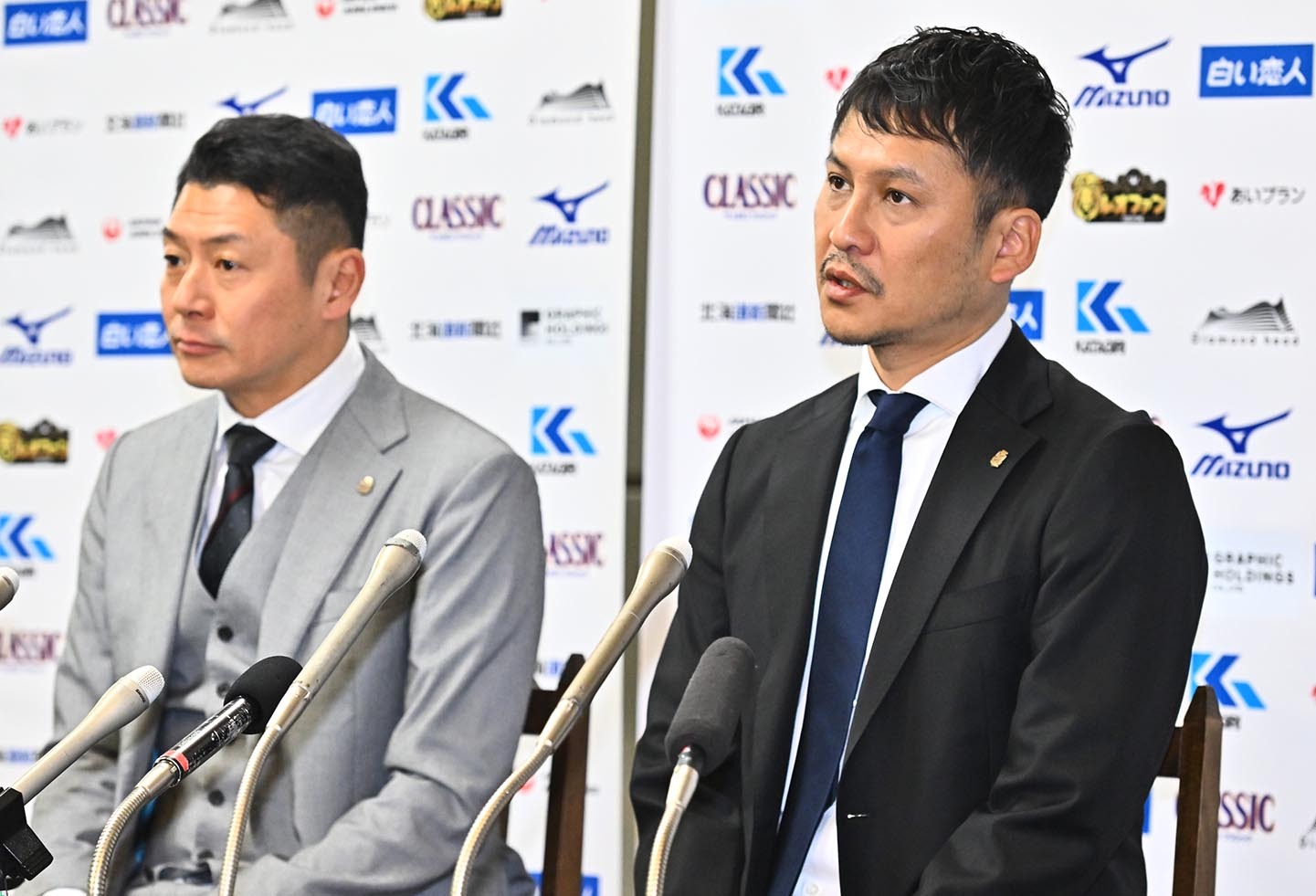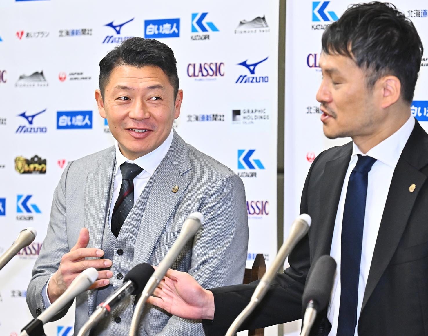 北海道コンサドーレ札幌は11日、22年から24年途中まで当時J1の鳥栖で指揮官を務めた川井健太新監督(44)の就任会見を、札幌・宮の沢白い恋人サッカー場で行った。また12日付けで本紙評論家の河合竜二氏(47)のゼネラルマネジャー(GM)就任と、昨季途中から指揮を執った柴田慎吾前監督(40)のトップチームコーチ就任も併せて発表した。会見に出席した川井新監督と河合新GMの主な一問一答は次の通り。