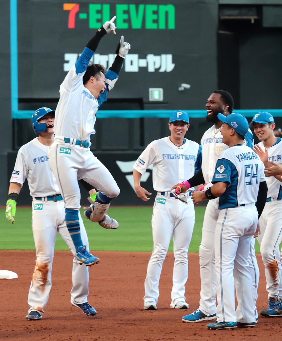 8月24日 のソフトバンク戦、延長十回1死満塁、サヨナラ打を放ち、喜ぶ奈良間(左から2人目)を笑顔で見つめる松本剛(同3人目)