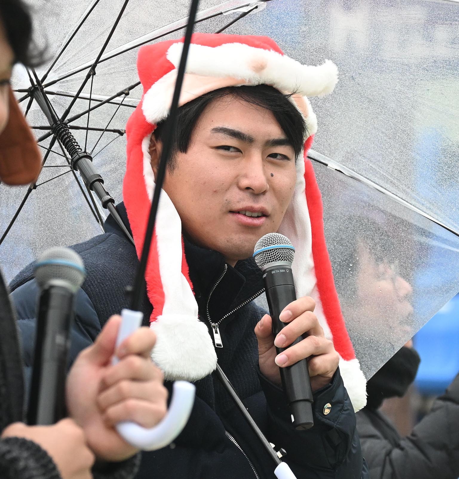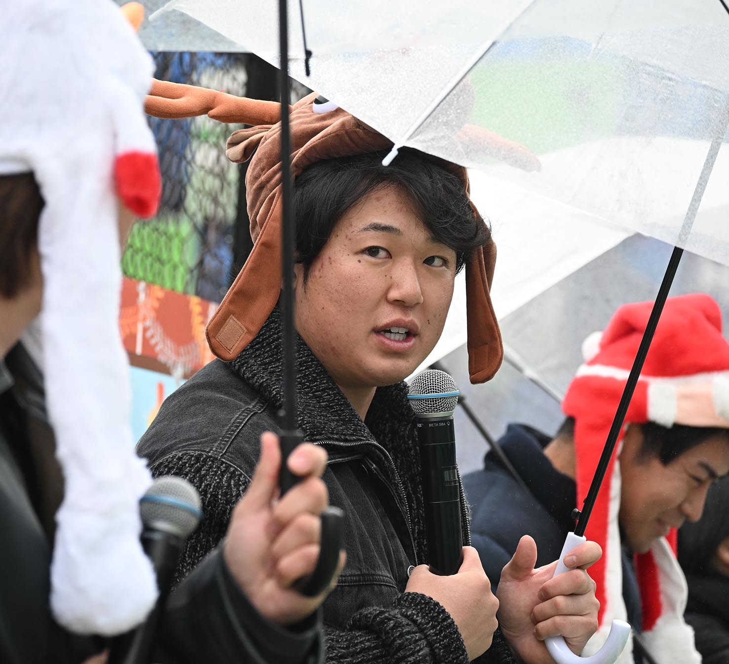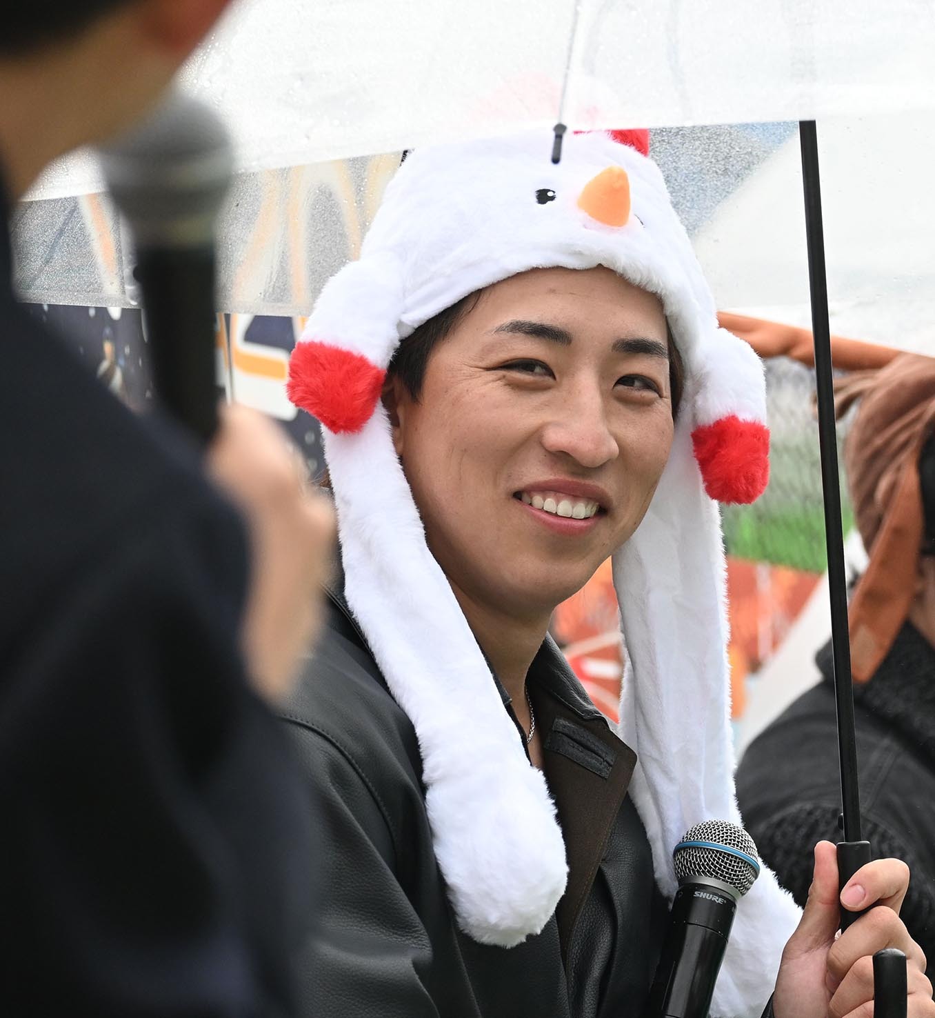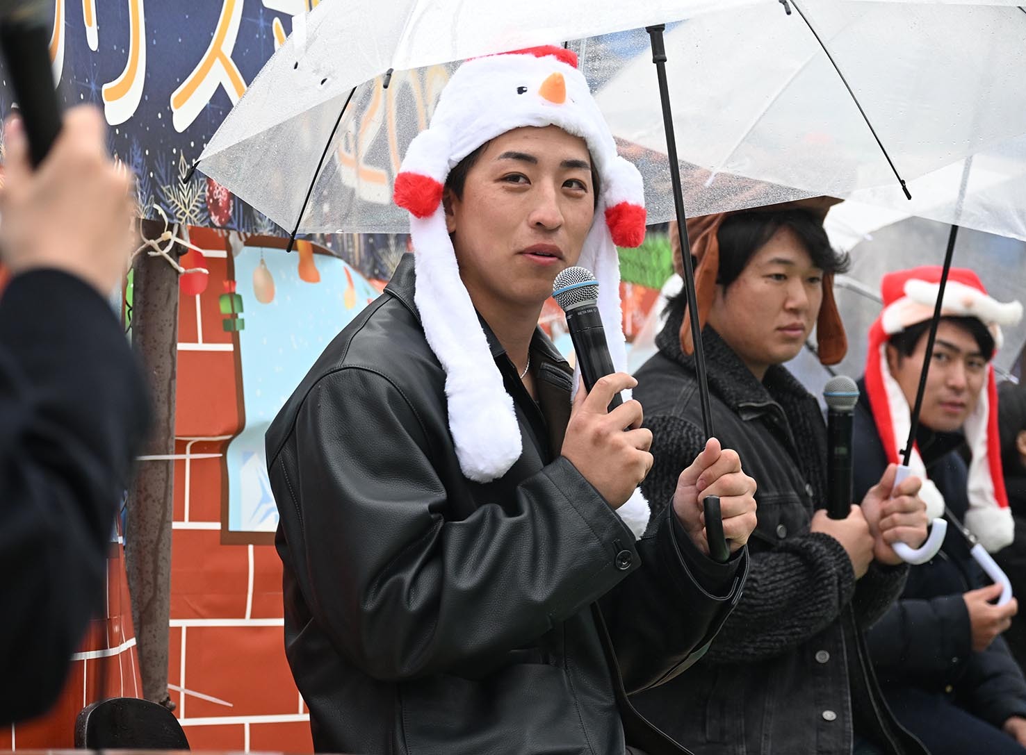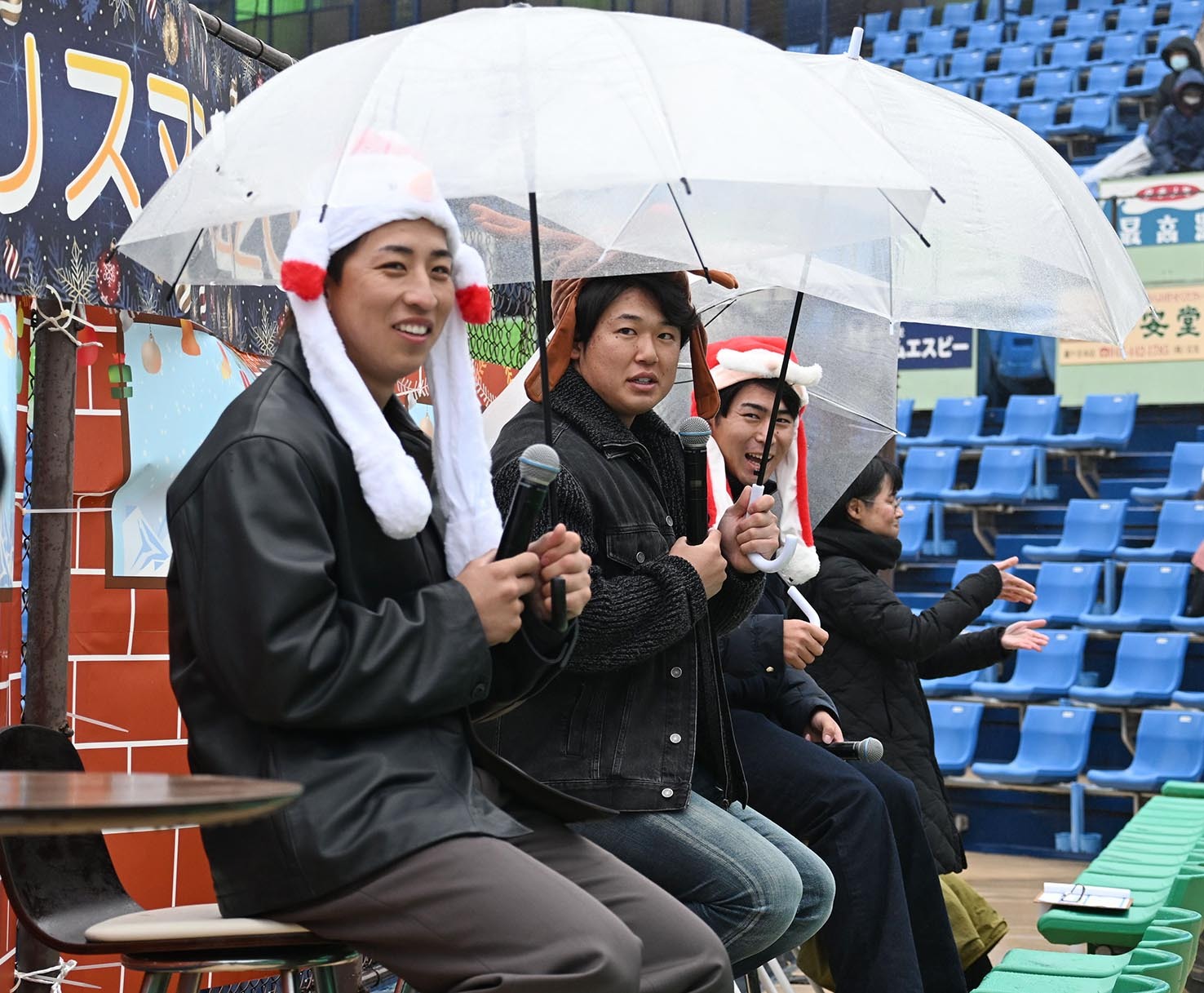 霧雨が降り続け、あっという間に手がかじかむ寒さの中、同期トリオの軽妙なトークがスタンドのファンを温めた。MCのHTBアナウンサー・菊地友弘さんに呼び込まれ、おしゃれな私服姿で登場。まずは雨男探しからスタートし、進藤が細野と宮崎に疑いの目を向けた。