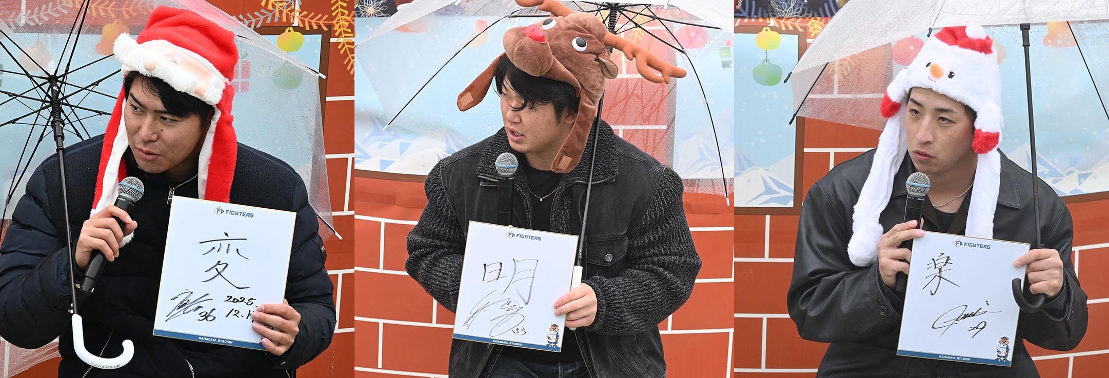 日本ハムの細野晴希投手(23)、進藤勇也捕手(23)、宮崎一樹外野手(24)が14日、千葉・鎌ケ谷の2軍施設で行われた「鎌スタ☆クリスマス会」に参加し、暴露話あり、失敗談あり、クレームありと、同期らしく遠慮のない掛け合いで場を盛り上げた。