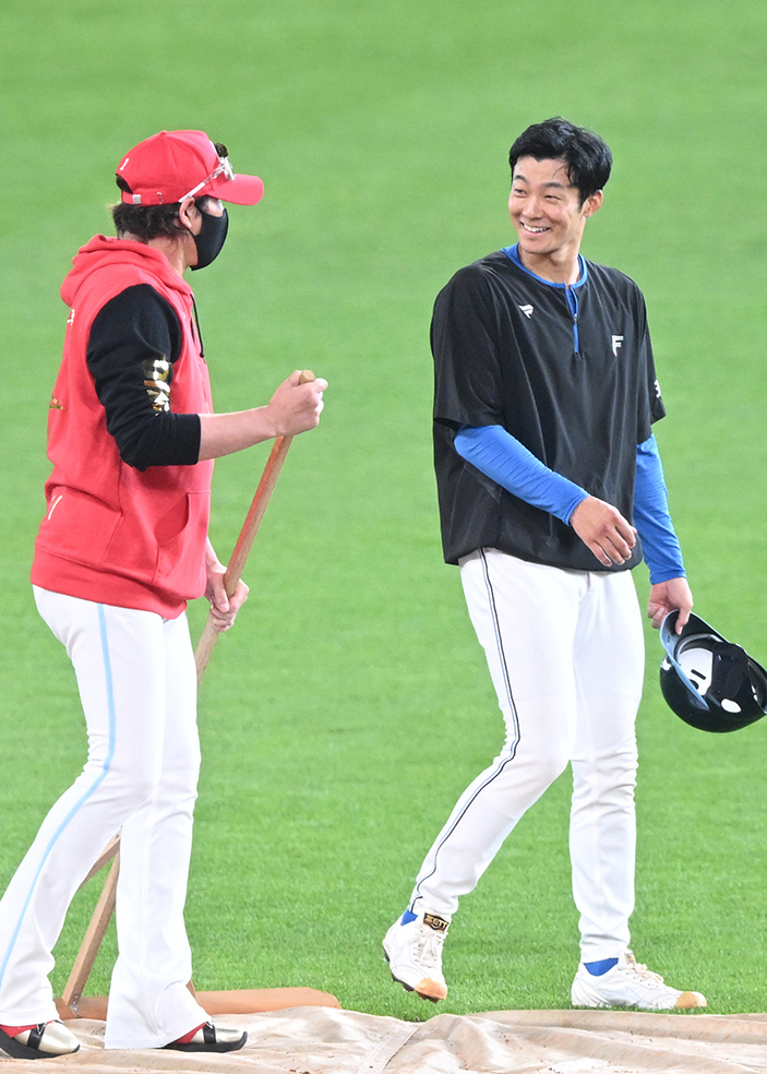 7月31日のソフトバンク戦、試合前練習で新庄監督(左)に声をかけられる石井