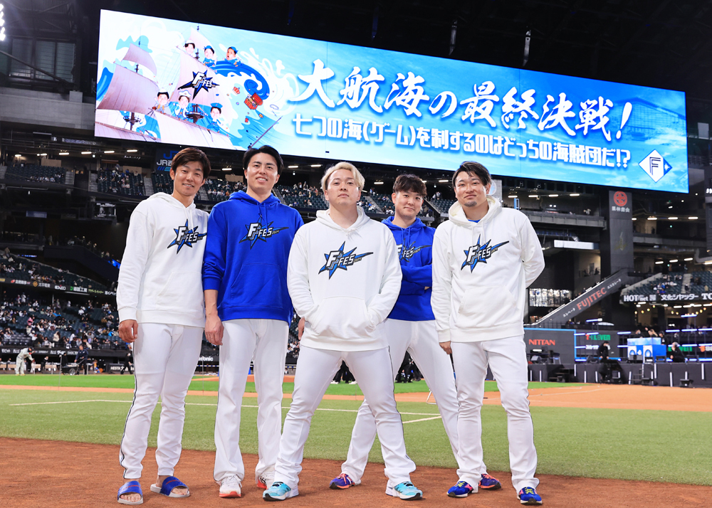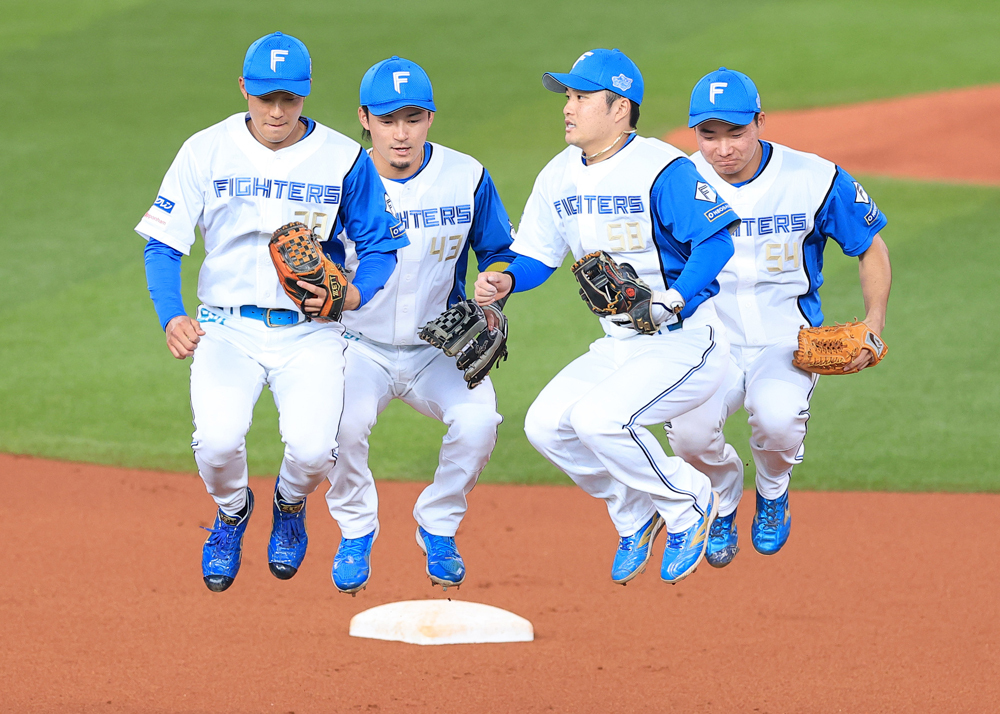 10月11日のオリックス戦、親ガモ(中島)不在も子ガモ達(左から)石井、水野、奈良間、山県が息の合ったアップをする