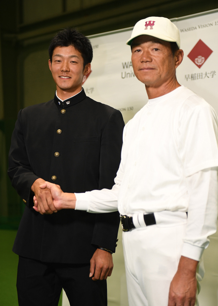 「(当時の早大監督)高橋さんとですね。めっちゃ懐かしいです。ドラフト当日はロビーでみんな集まって中継を見ていたんですよ。どこかは指名してくれるかなと見ていたんですけど、まさか最初の方に呼ばれて。うわ~みたいな超盛り上がってみんな喜んでくれましたね。あんま(顔も)変わらないですね。高橋さんは3年、4年。1年、2年は岡村監督にお世話になりました」