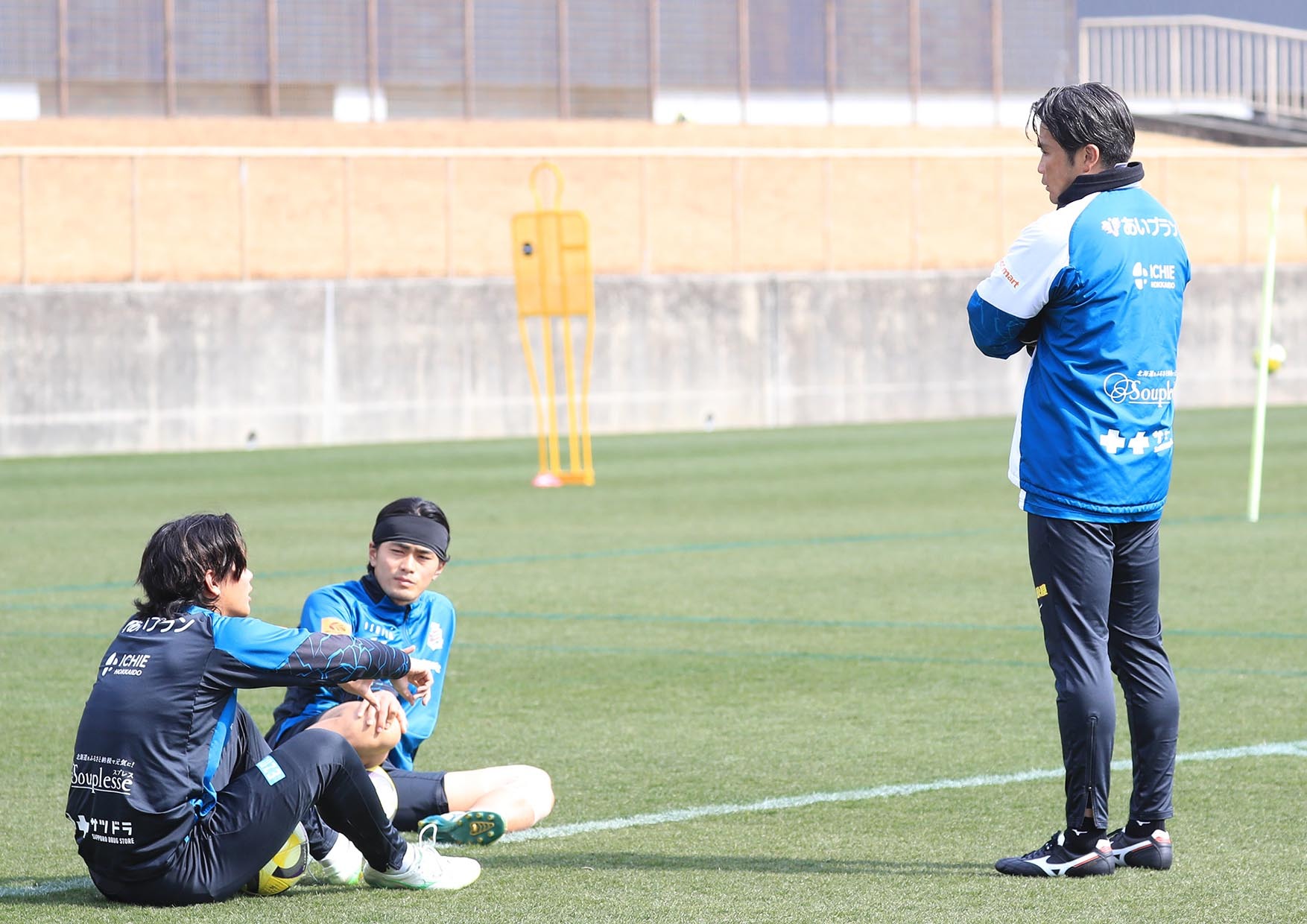 2025年2月21日、熊本キャンプの全体練習終了後、西野(左)と馬場(同2人目)が岩政監督と話し込む